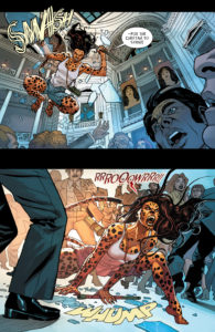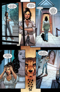 The Cheetah finally unsheathes her claws and spews her venomous hatred towards Wondy. The acknowledgment of the first incarnation is a respectful nod to the character. The new version is the most current in the comics, Dr. Barbara Minerva, who is a were-cat rather than a costumed criminal. Barbara is a respected archaeologist but her academic contributions are brushed aside when the museum’s curator Director Schultz wants to honour the star-spangled stunner to attract more numbers. The origin is purely accidental. However, coupled with bitterness and jealousy, the Cheetah is an unpredictable and vicious villainess. Her speed doesn’t compare to Diana’s who has Hermes to thank. Those bracelets don’t just deflect bullets, they work well against slashing! Creating an army of were-cheetahs and mind-controlling zoo cats are futile actions. Wonder Woman comes out on top!! The ferocious feline quickly retreats and is caged.