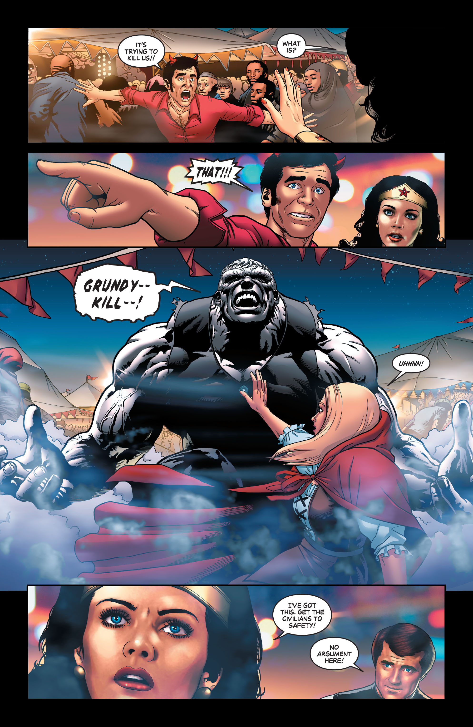 Jason Badower is a mainstay at DC Digital Comics, having illustrated WW in SENSATION COMICS as well as working on ARROW: SEASON 2.5 and FLASH: SEASON ZERO. Grundy is a massive menacing brick house who means business. His urge to protect his descendant is akin to the Golem. I wonder if the artists are assigned due to their uncanny ability in authentically interpreting Lynda Carter on the pages. My jaw dropped at her exquisite features and graceful poses, expertly done by Mr. Badower.