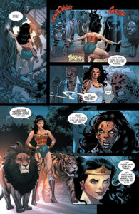 Mssrs. Johnson & Ortiz share art duties. I was ambitious enough to read the digital copies first. Drew covered the first ten pages whereas Richard penciled the other twenty. Mr. Johnson’s speciality is faces. The eyes are rich and piercing, the skin silky smooth. Barbara’s almond-shaped orbs and bun-ful hair are a precursor to her transformation. Mr. Ortiz doesn’t bedazzle WW as much but the Cheetah is a full-fledged furious felid!!! I’d love to her IRL on the small screen. The animals are as life-like as those on Wild Kingdom.