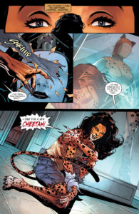 Wes Abbott comes up with original onomatopœia like KISH and SHRIIIP. The font for Cheetah’s speech is more narrow and scratchy, especially when she yells at the top of her lungs. Her claws aren’t the only sharp objects!