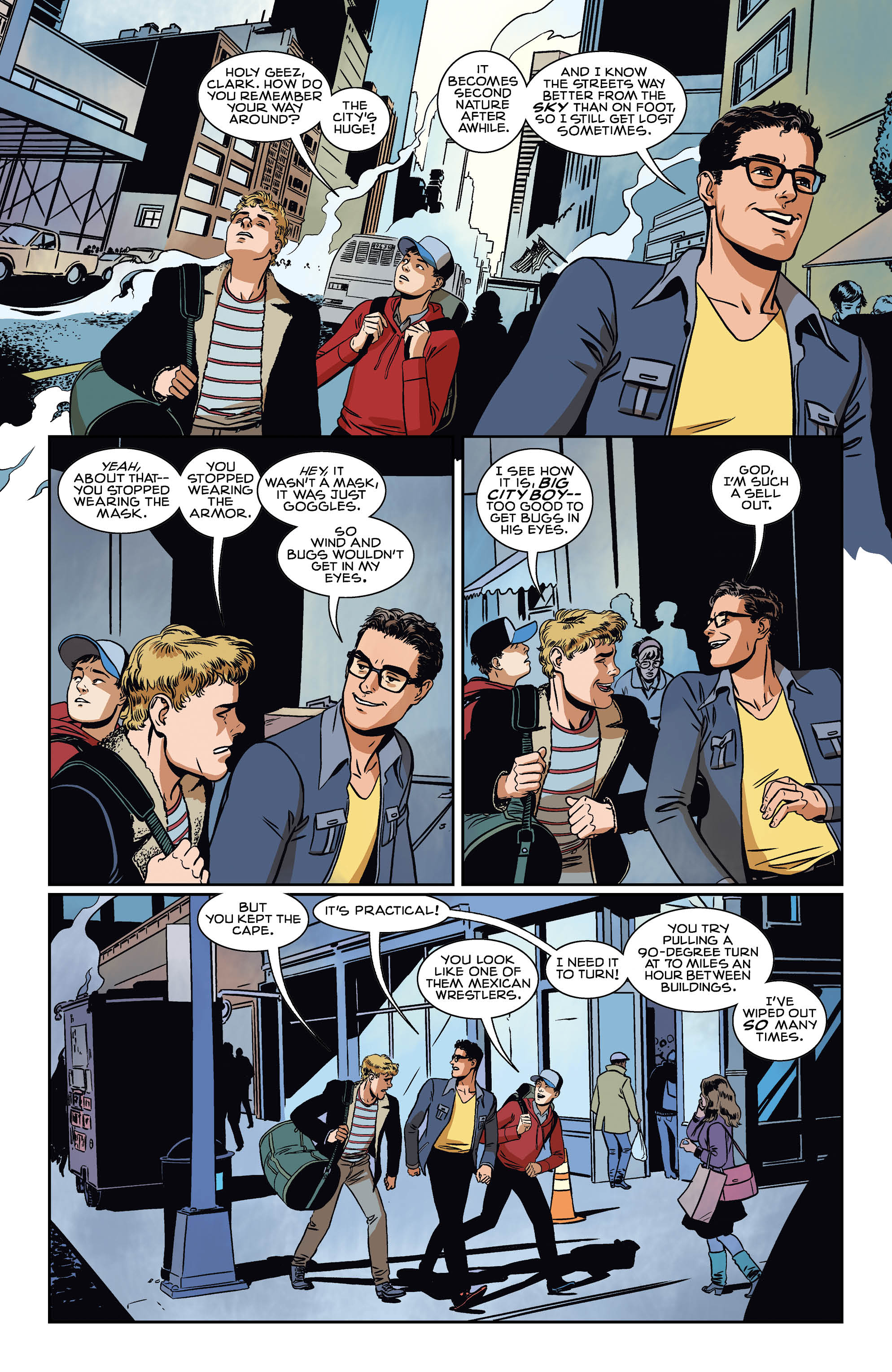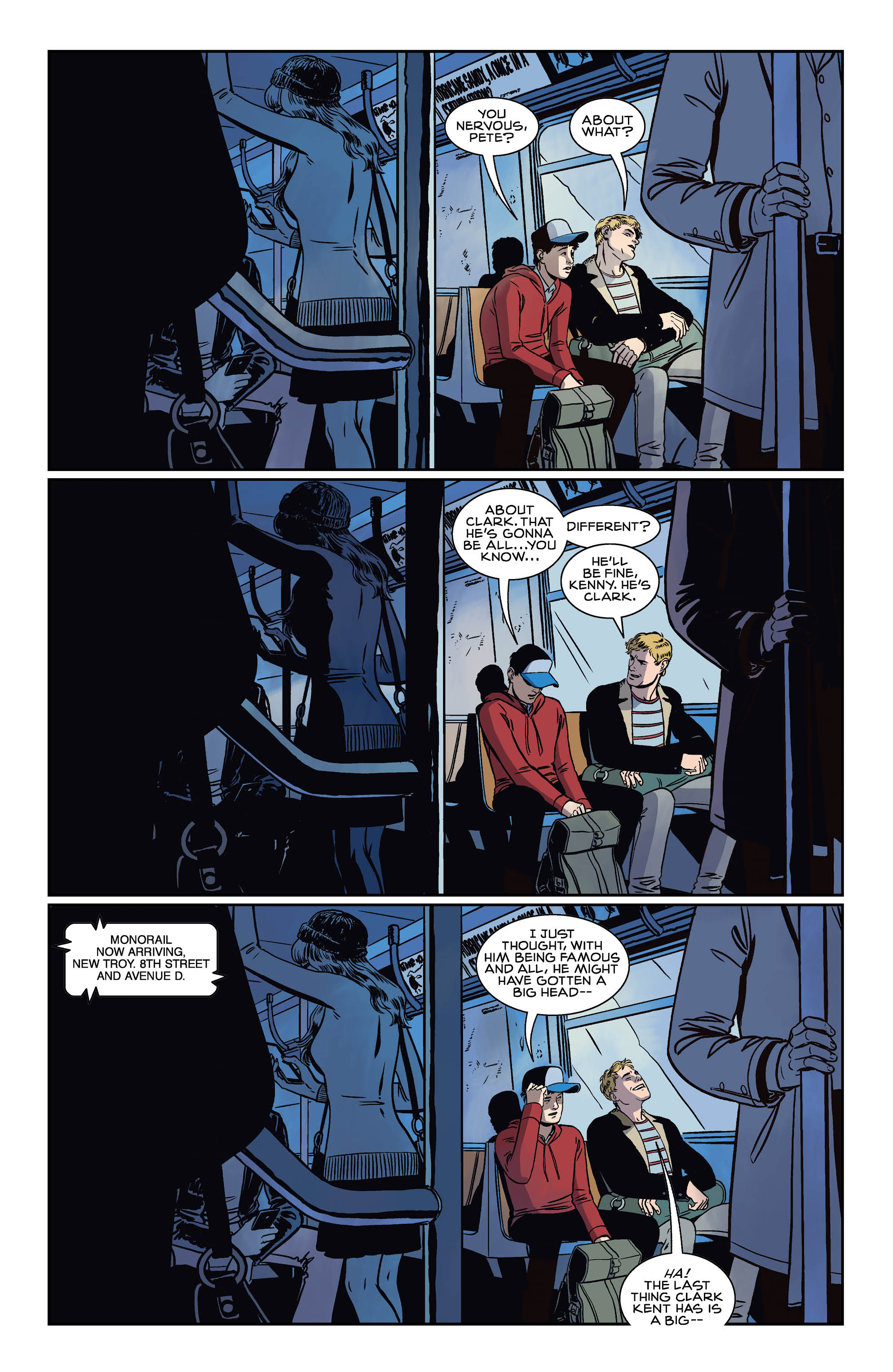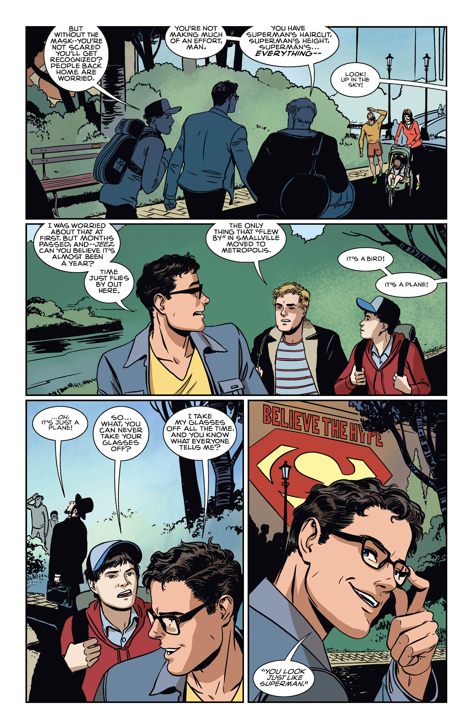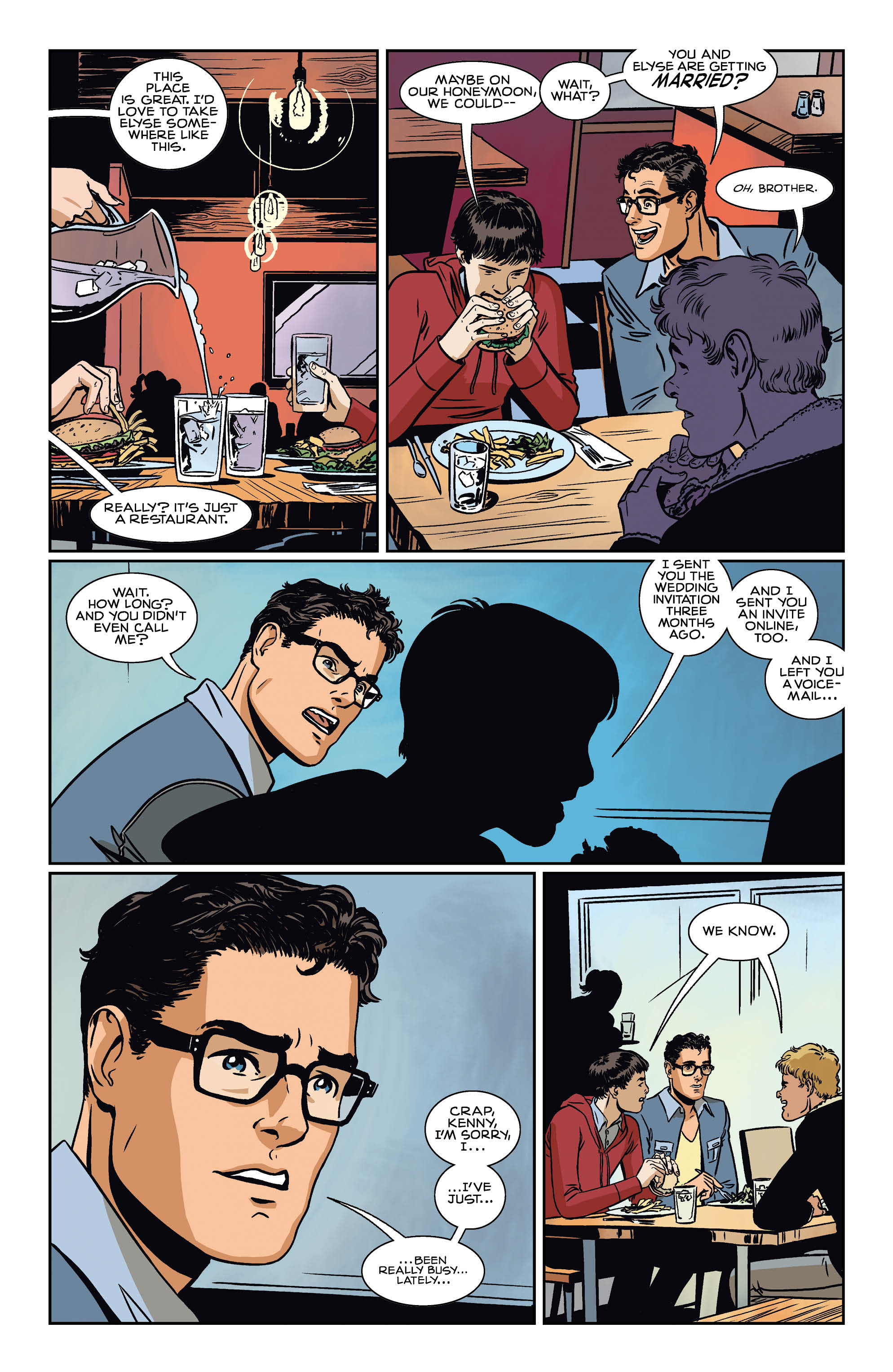 Clark gets a visit from his Smallville friends Pete Ross and Kenny and the issue focuses on the young men reconnecting after some time apart. With Clark still in the early days of his fledgling superhero career, the visit from Pete and Kenny and their analysis of his baby steps into notoriety could easily be paralleled in real life by a sports star being visited in the big city by childhood friends.