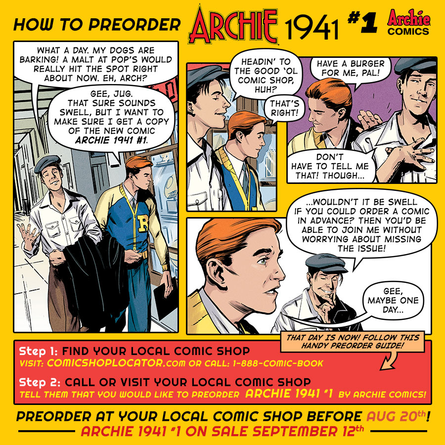 ARCHIE 1941 #1 is a five-issue historical fiction limited series by writers Mark Waid and Brian Augustyn, artist Peter Krause, colorist Kelly Fitzpatrick, and letterer Jack Morelli in which the Riverdale teens deal with the consequences of impending war in Europe.