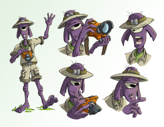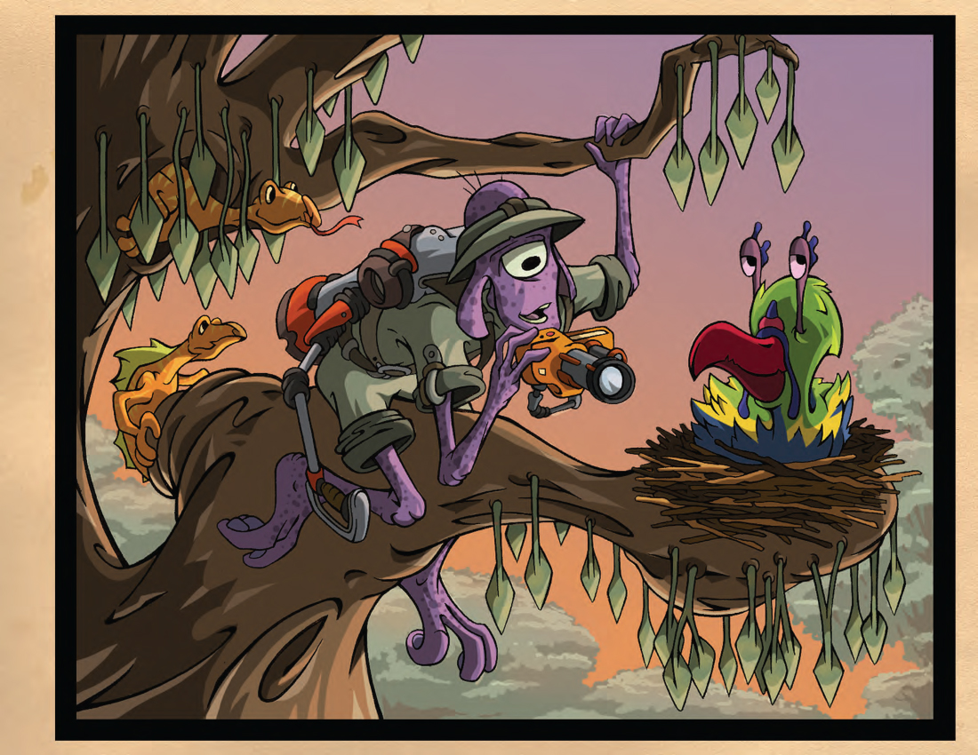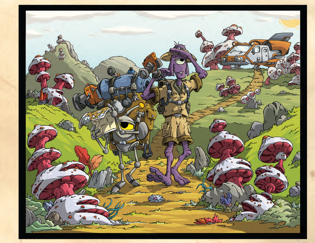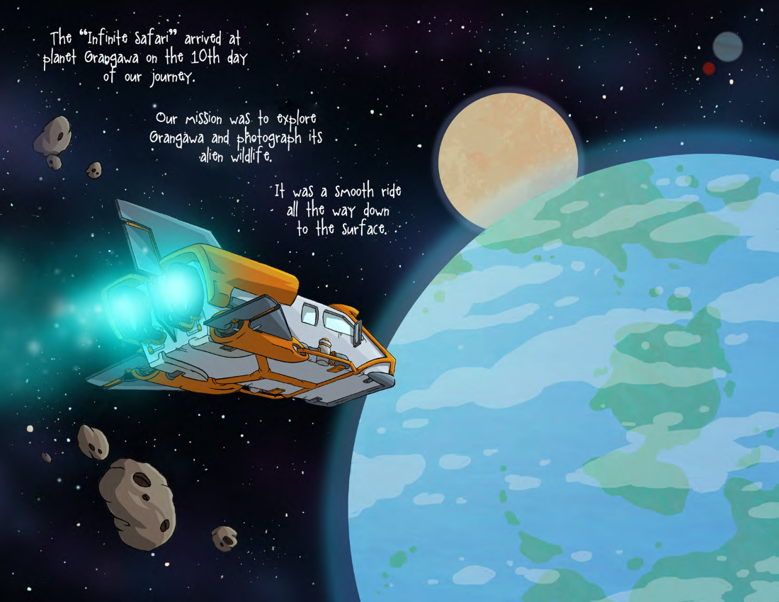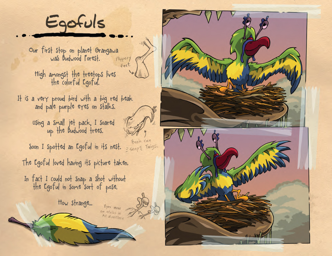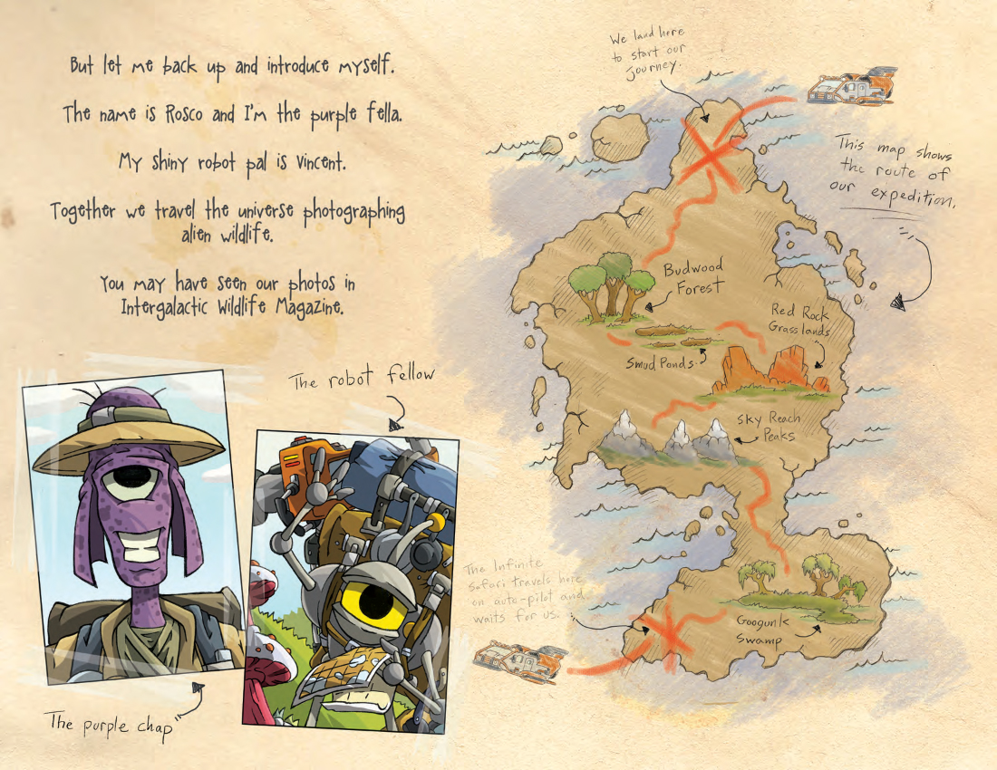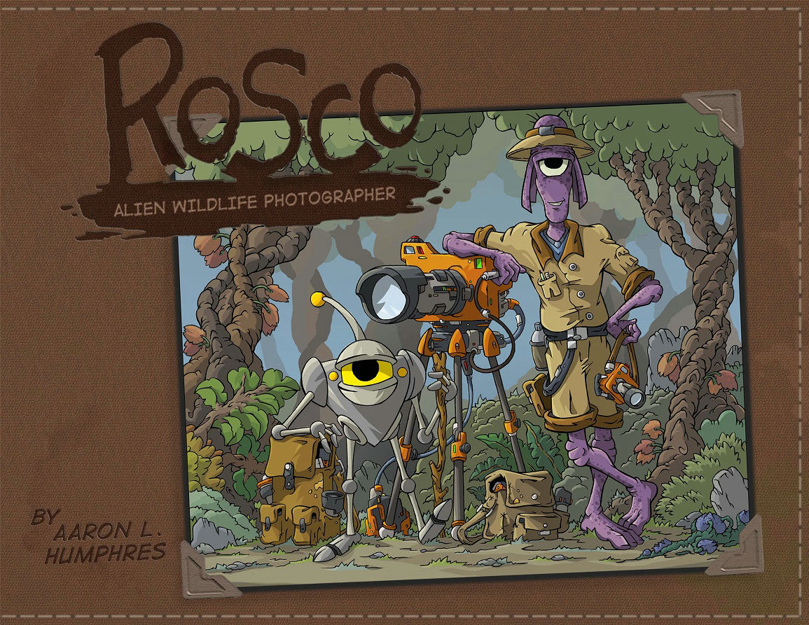 Imagine yourself on an exotic, alien planet in search of strange, alien wildlife… to photograph. This is the job of Rosco in his new colorful book aptly titled ROSCO: ALIEN WILDLIFE PHOTOGRAPHER. This hardcover book is ANIMAL PLANET mixed with POKEMON, with a splash of RATCHET AND CLANK. So come join the intrepid Rosco and his robot buddy Vincent as they scour the planet of Grangawa in pursuit of colorful aliens to capture on film.