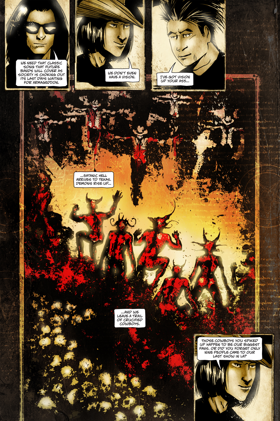 “A bold and rambunctious rock’n roll tale” – Fanboy Comics … Broke and directionless, the three members of the metal band Satanic Hell arrive in Texas for a chance tour set up by a mysterious promoter. Death Priest, Dante, and Exodus quickly find trouble in the bizarre world of Texas, now controlled by a council of religious fanatics. The quixotic tour is Satanic Hell’s last chance to keep their rock’n roll dreams alive but doing so means going through their own version of hell on earth. Can three guys in a metal band save the Holy State from itself and survive? This is the complete seven-issue series of the metal band’s raucous tour through the dystopian Lone Star State.  200 epic pages with added bonus material!