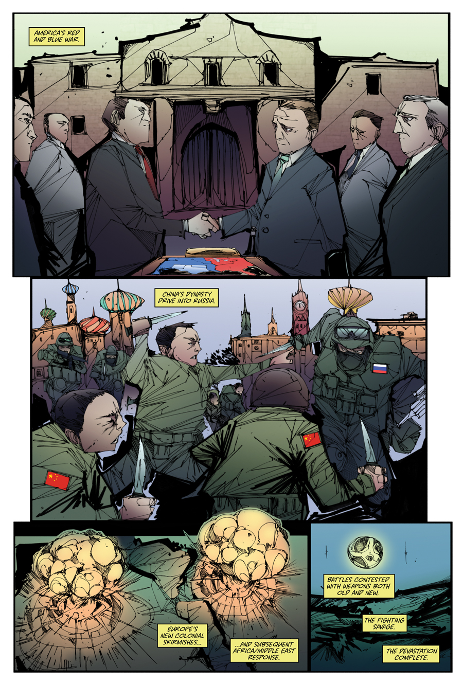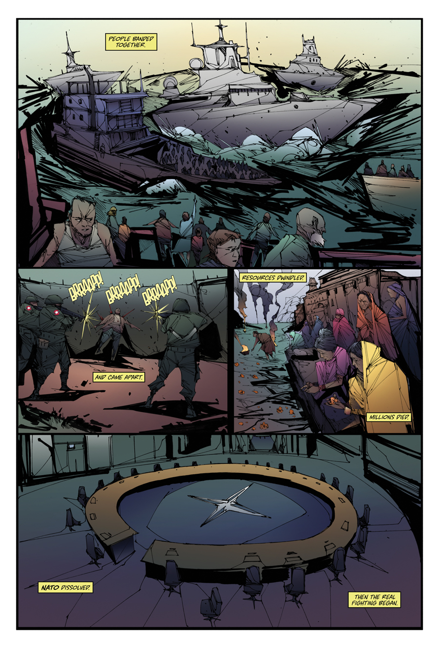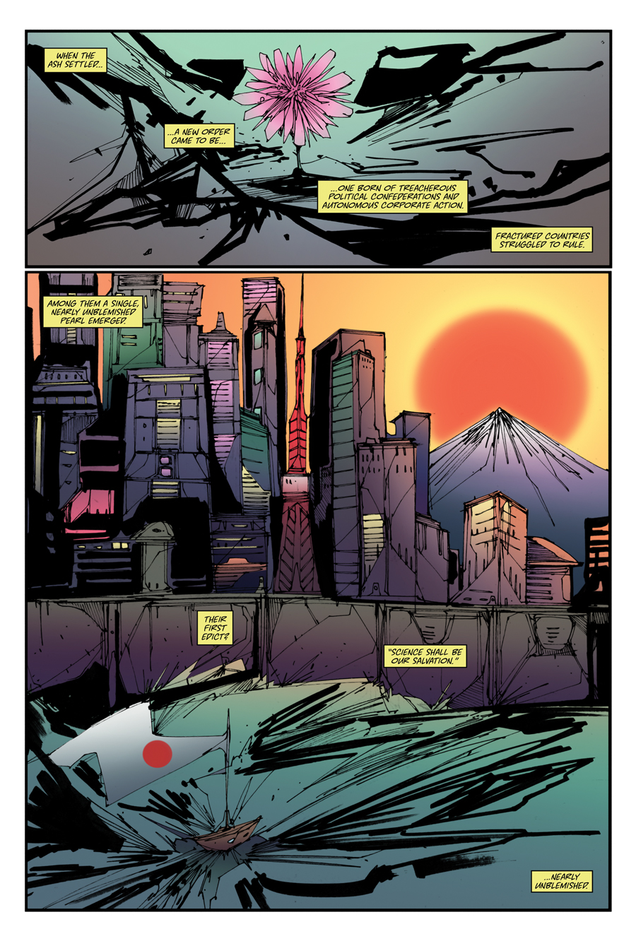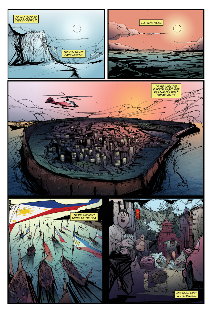 The polar ice caps melted and the oceans rose. Nations were swept away in the deluge. World governments were fractured by war. Corporations filled the void. Millions died. Resources dwindled and flight became a thing of the past. Mankind was nearly lost forever. But life was clawed back through science and blood. Follow Hans and the rest of the crew of the Runaway Horse as they make their way in the New Pacific, a world of ruthless business, uneasy truces, and shifting alliances. A world abided by steel, marked by mutation, and at the mercy of the violent sea.