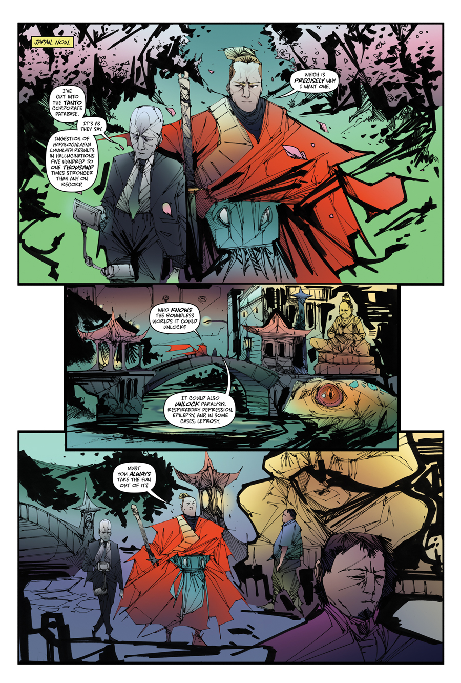 Captain Hans Tanaka and his mutant valet, Saigo head into town for some drinks and to bid on piece of stolen property. When the company it was stolen from wants it’s property back, Hans, Saigo, and the rest of the crew find themselves on the run from the powerful Tanto corporation.