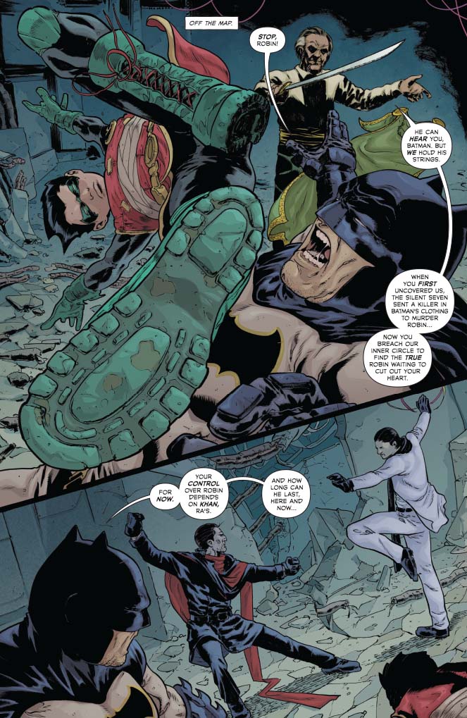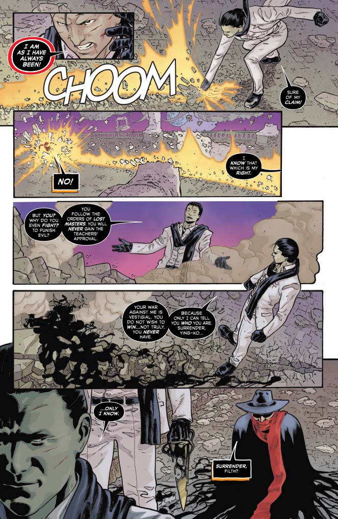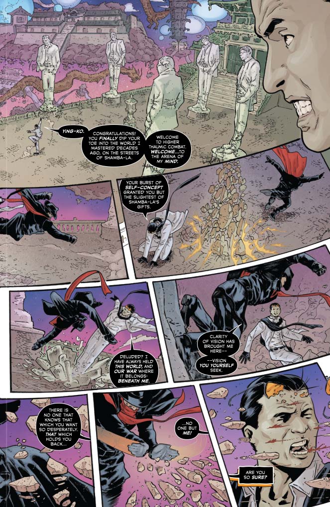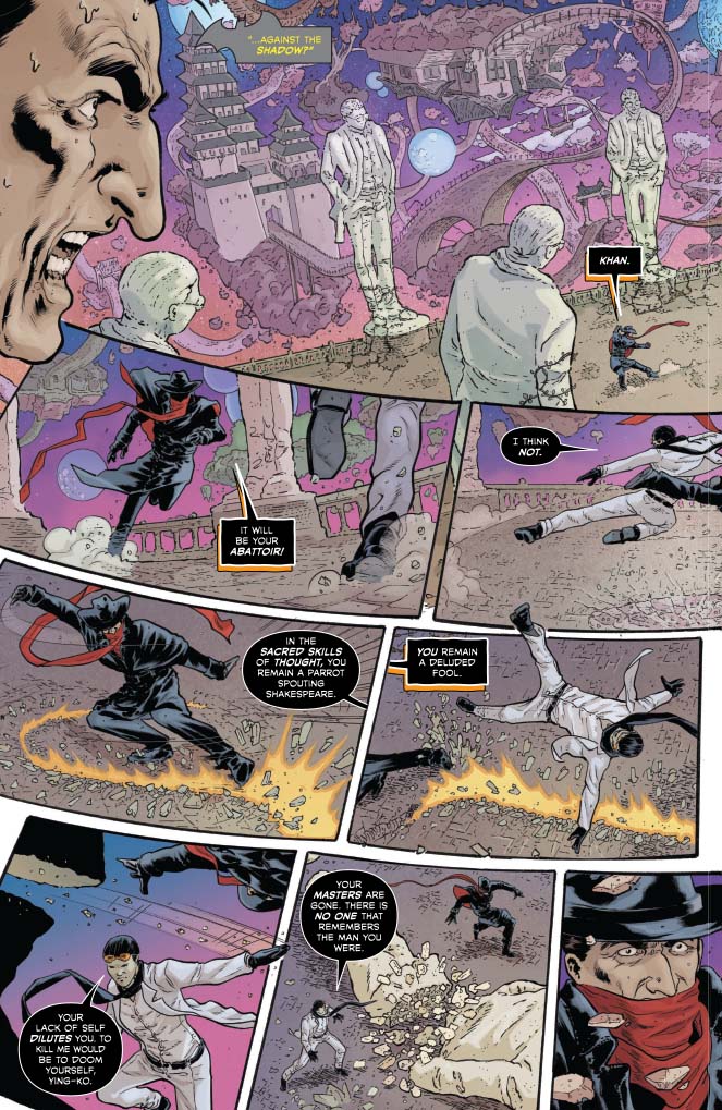 For centuries, the Silent Seven has held Earth in its evil grip…but nothing lasts forever. The Shadow and Batman have infiltrated the Seven’s personal stronghold, hidden off the map and away from history, at great personal cost. They didn’t expect to find one of their own standing against them once they arrived. It’s Robin versus Batman with society itself in the balance as the Shadow steps into the one place even he has feared to go: The Deadly Mind of Shiwan Khan. Can three generations of crimefighting overcome centuries of evil? It’s a crucible they can only overcome through the one thing none of them have: trust.
