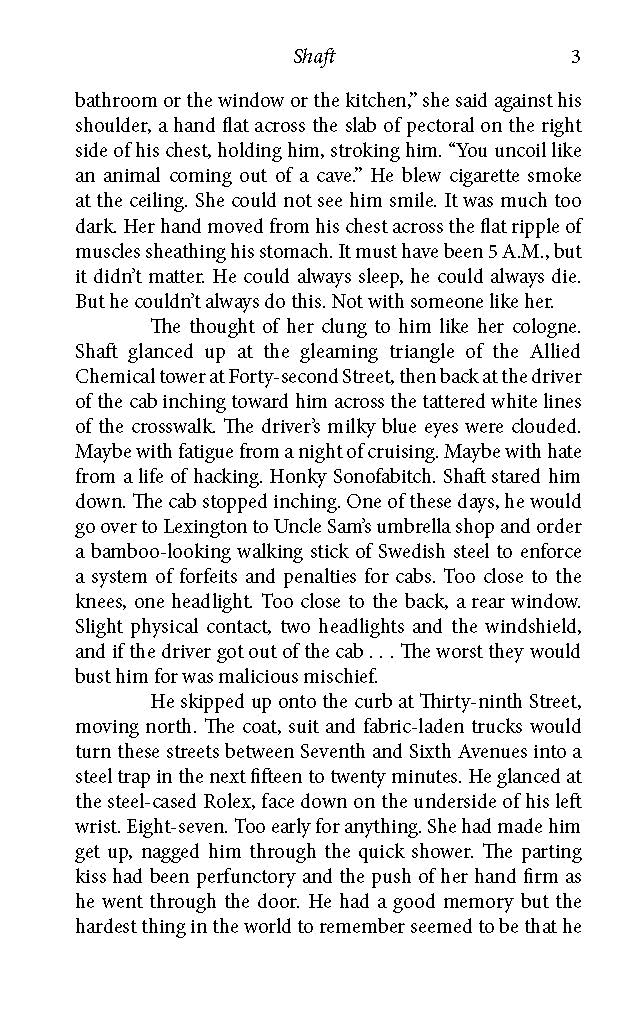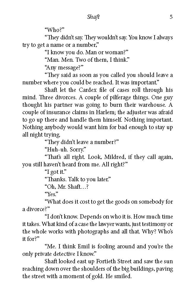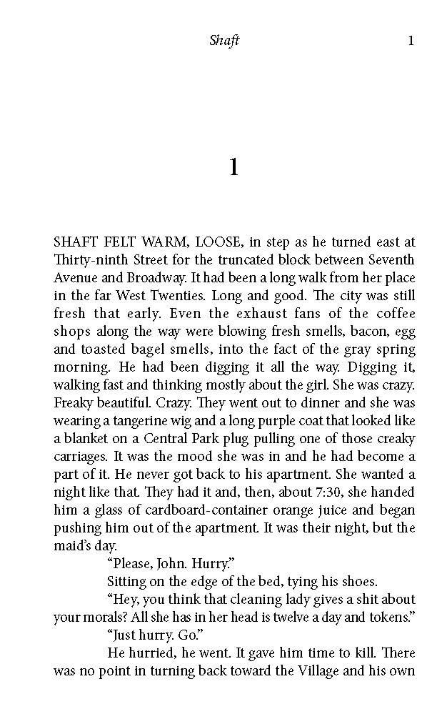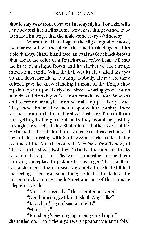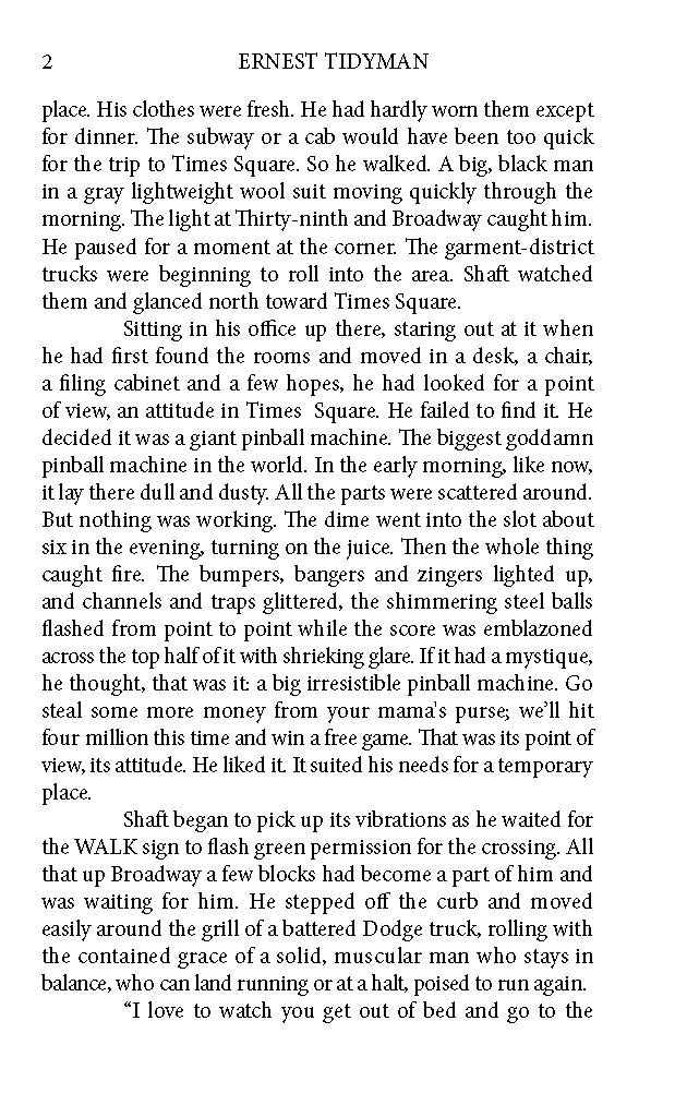 Who is John Shaft? John Shaft is a private eye. John Shaft is a black man made of muscle and ice, and he has no prejudices. John Shaft will kill anyone… black or white.  When the cloistered daughter of Harlem’s crime boss discovers the true nature of her father’s work, she runs off to be as bad as Dad. By the time she disappears, she’s into sex, liquor, dope, and a few other scenes. Now, Big Daddy wants Shaft to get his baby back. The tough, take-no-guff detective goes to work… and the Mafia, the Black militants, the NYPD, and City Hall go to work on him.  The original and unabridged Shaft novel by Ernest Tidyman, the 1970 tour de force of hardboiled crime fiction that introduced an unsuspecting world to a cultural icon.