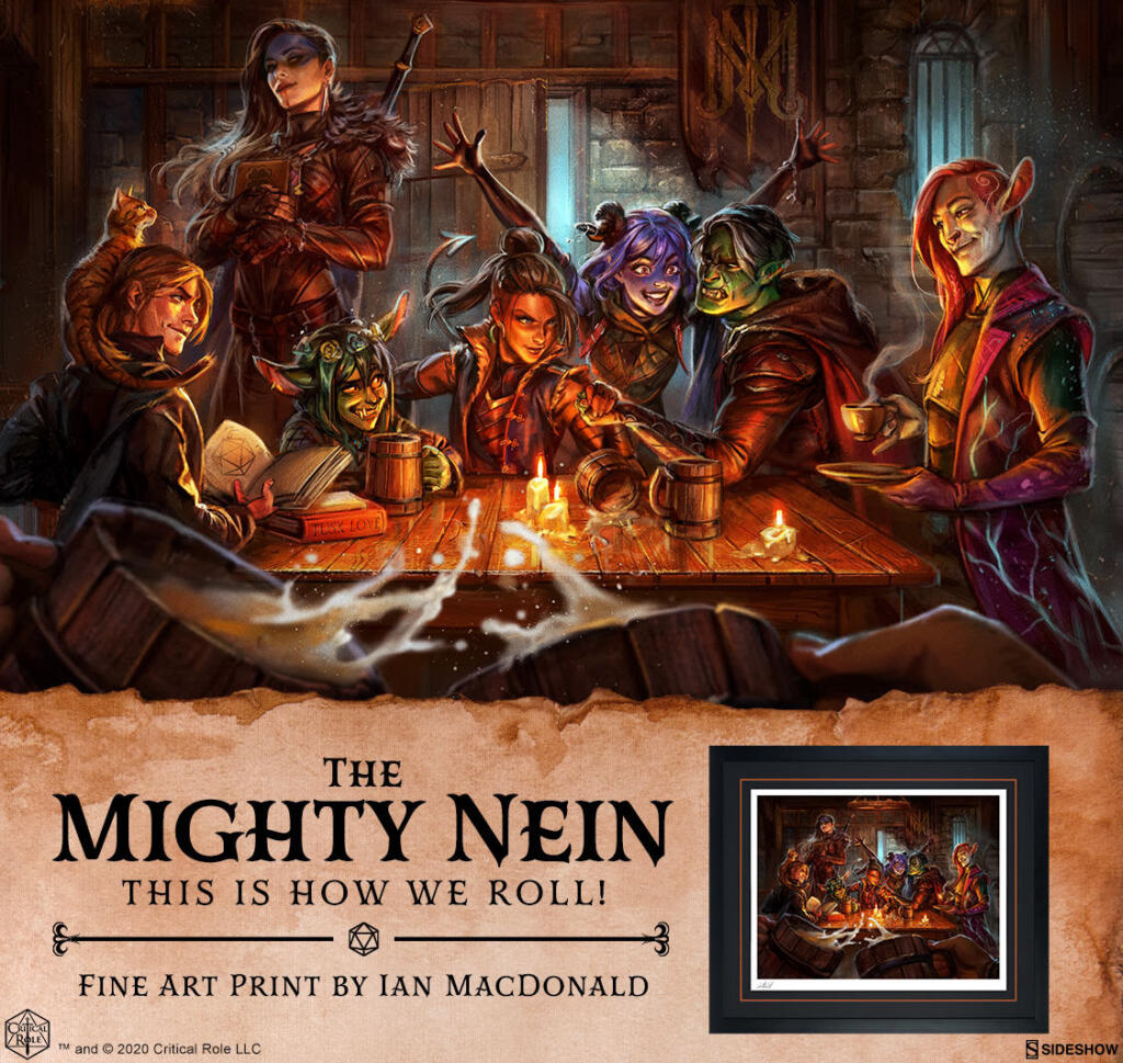 Starting with the show’s current campaign, the heroes of the Mighty Nein get the spotlight in the Mighty Nein: This is How We Roll! Fine Art Print by artist Ian MacDonald. This vibrant illustration catches the adventurers taking a short rest in a local tavern, celebrating their fantastic travels. Packed with visual Easter eggs, this high-end collectible art print will be available for pre-order on Thursday, December 17th, 2020, with custom framed and unframed options available.