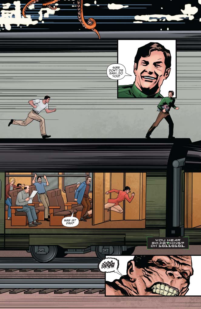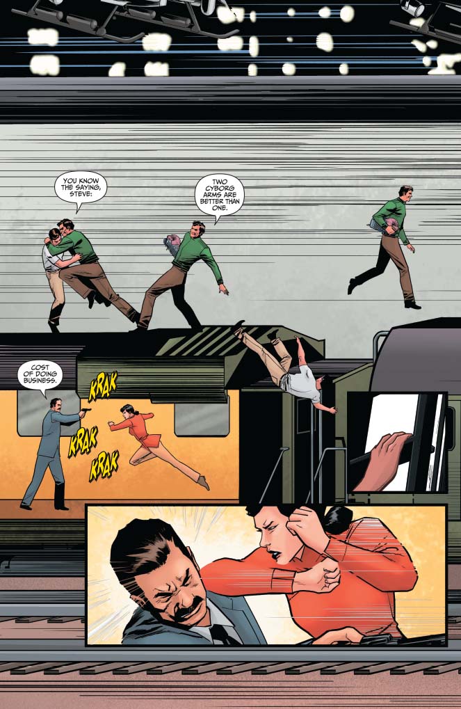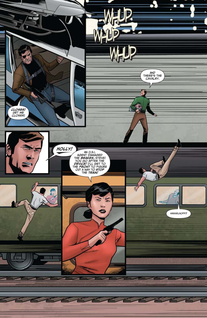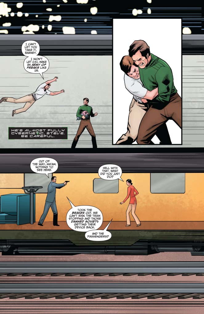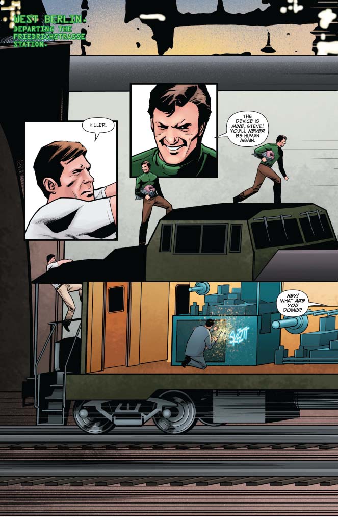This issue’s so packed with action and insanity that we just had to break the mold! This issue reads like no comic you’ve seen before! Join Steve Austin on a scenic tour of Germany’s cities, countryside and mountains—at 100mph while battling agents of OSI! WE know Steve’s no traitor, but they don’t, and the stakes are more than just life and death—Steve’s very humanity is hanging in the balance!