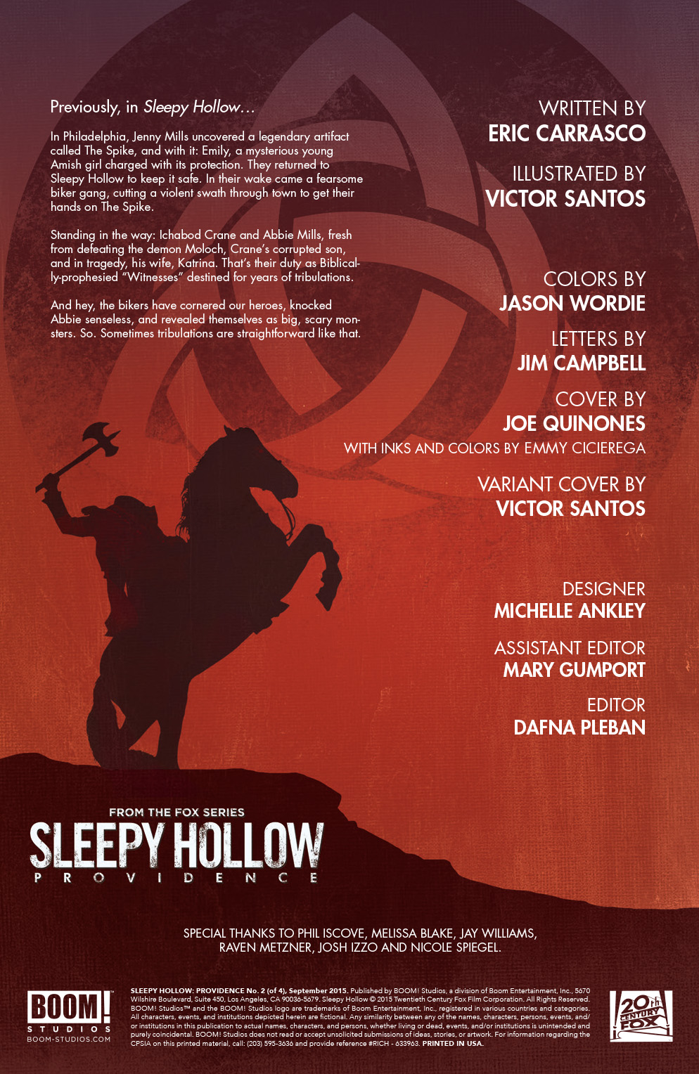 PreviewsBOOM! Studios Previews Sleepy Hollow: Providence #2 (of 4) By Comix Asylum - Sep 7, 2015 0 693 FacebookTwitterPinterestWhatsApp Sleepy Hollow: Providence #2 (of 4) Writer: Eric Carrasco Artist: Victor Santos A terrifying, monstrous biker gang known as the Wild Hunt has marked Crane and is coming after him and the mysterious artifact. Sleepy Hollow: Providence #2 (of 4) 1 of 8