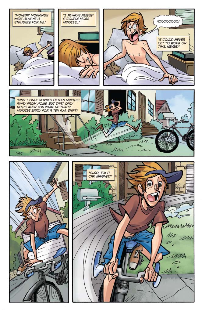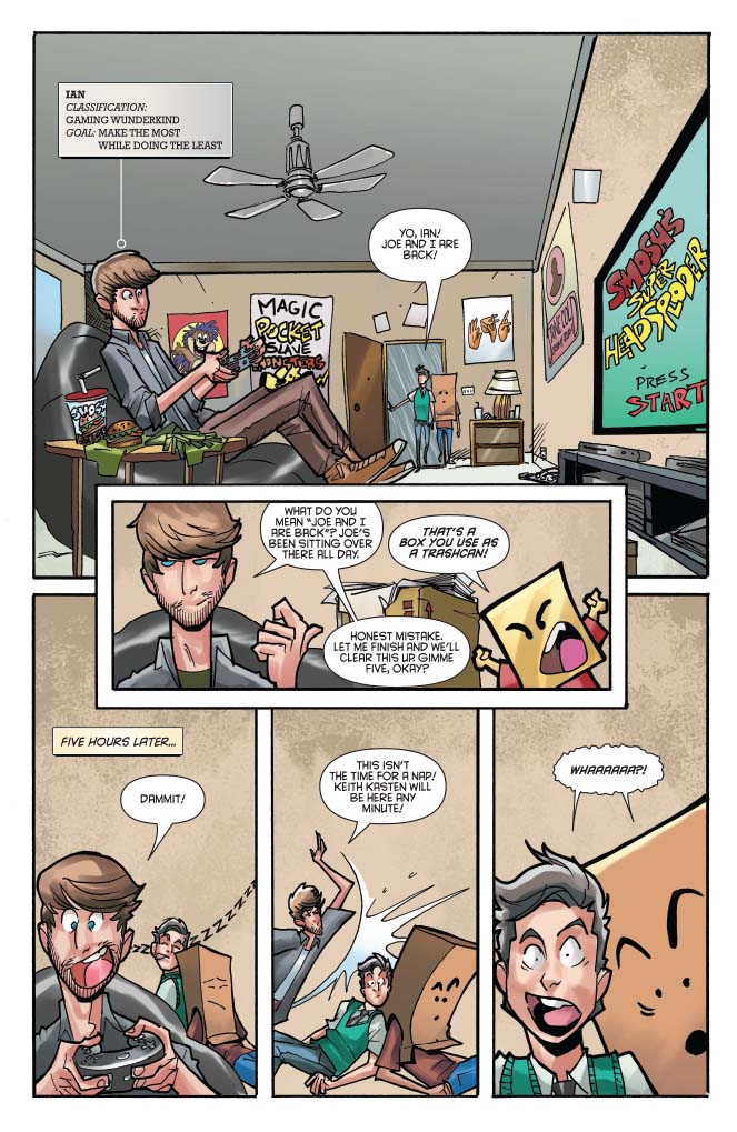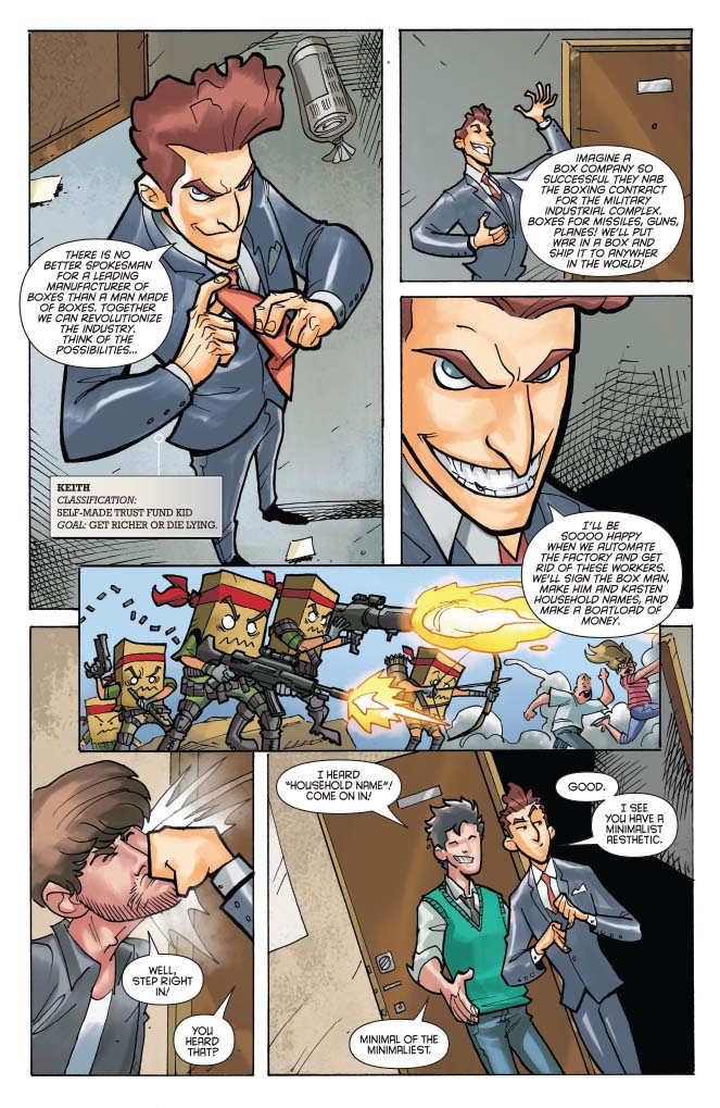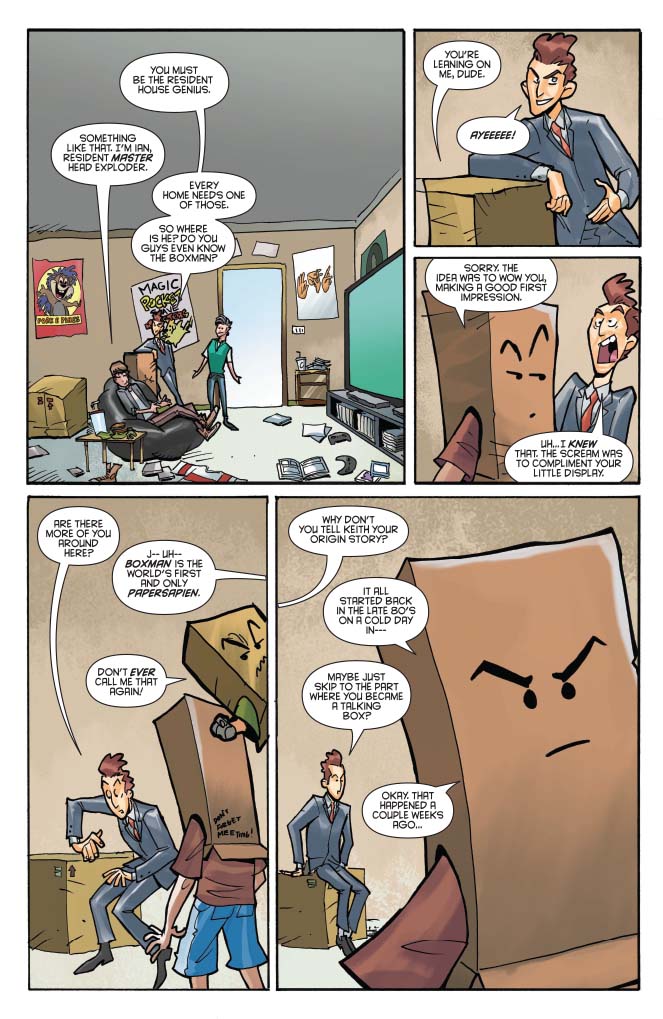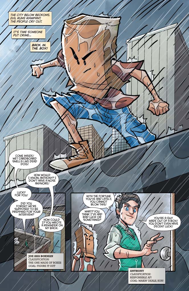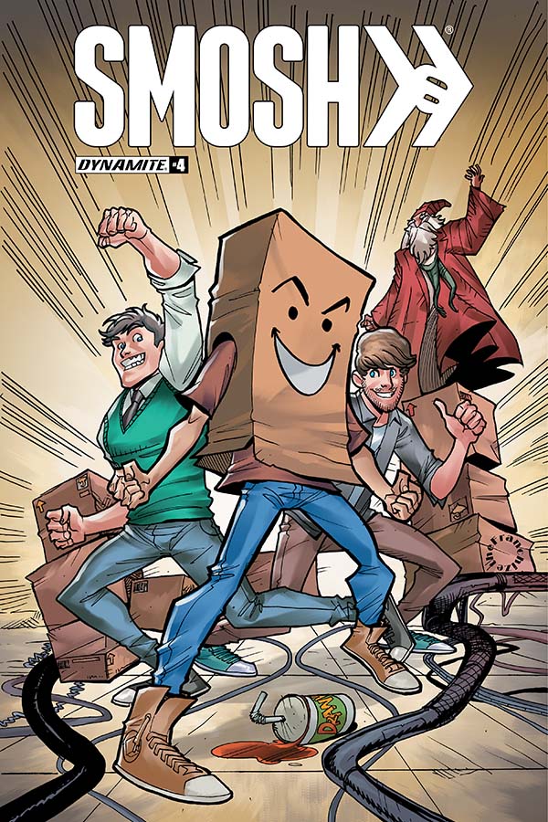 “Witness a tale of friendship, fame, and, freak accidents as Youtube sensation Box Man’s origin springs to life, in crazy detail, in Smoshverse no. 4! Thrill as Box Man and friends try to make sense of his weird twist of fate, first attempting to make him the first-ever cardboard hero and, when that fails, settling on celebrity spokesperson. But can a move made in desperation ever go wrong??? It’s a coming of age story like no other, mixing the ageless hard lessons of growing up with Smosh-style comedy of today.”