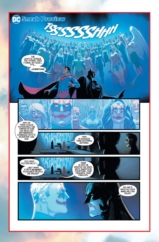 To launch the new DC series, the first arc of BATMAN/SUPERMAN will follow the two titular heroes as they hunt down six infected heroes in the DCU—people revealed to be infected by the Batman Who Laughs with a deadly pathogen that violently transforms them into the evilest versions of themselves. The Dark Knight and the Man of Steel must journey into the depths of Gotham City to learn which of their fellow heroes has been transformed into the horrifying horseman of their most dangerous and deranged foe ever.