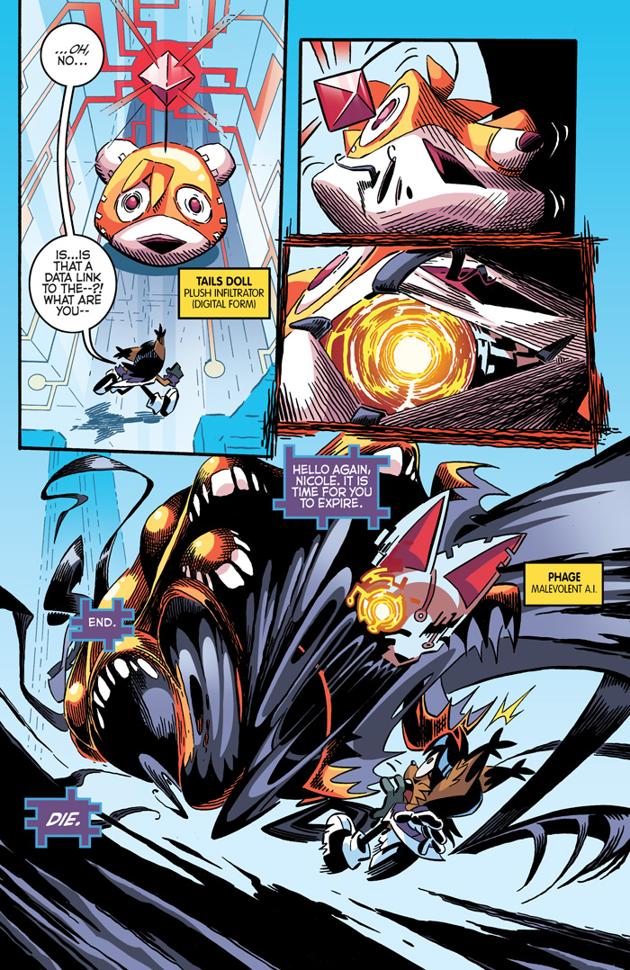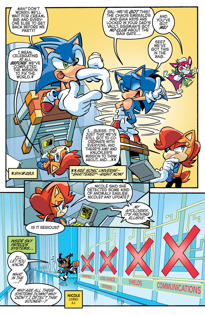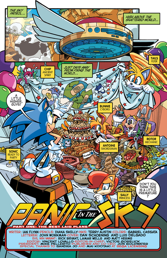 SONIC and friends get into some BIG TROUBLE in “Panic in the Sky” Part One: Sonic’s Freedom Fighters are finally ready to restore the planet! Unless, of course, someone does even more damage! Cue: the evil Dr. Eggman (of course)! He has a plan of his own and strikes first! The mad doctor launches a multi-pronged assault that will leave you speechless-everything has been building up to this moment! The final chapter to the Shattered World Saga begins here! Featuring the first of four EPIC connecting covers by mega-talent Dan Schoening and an “Evil Win” variant by the wonderful Lamar Wells!