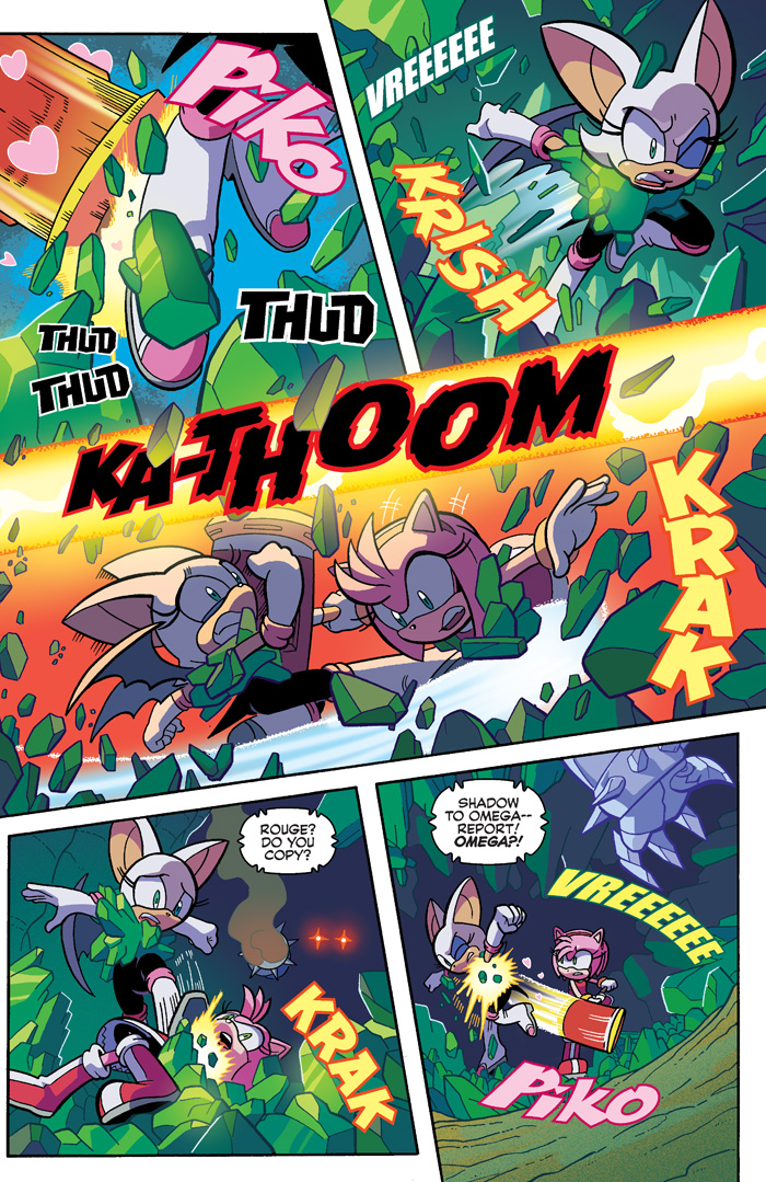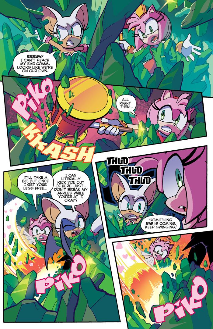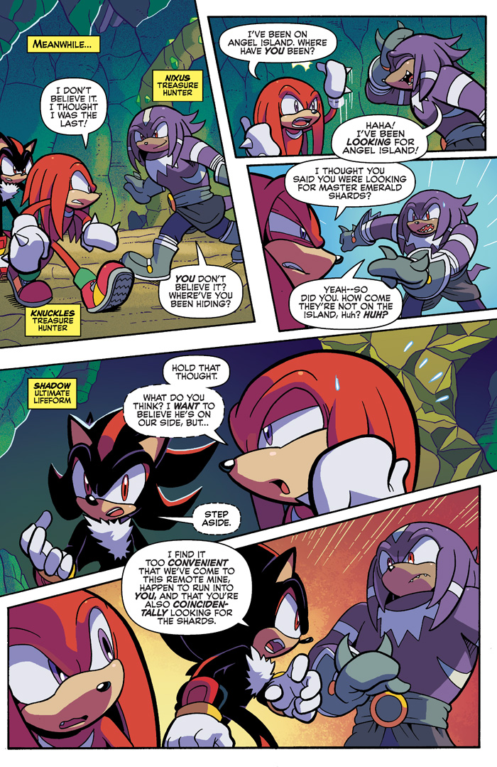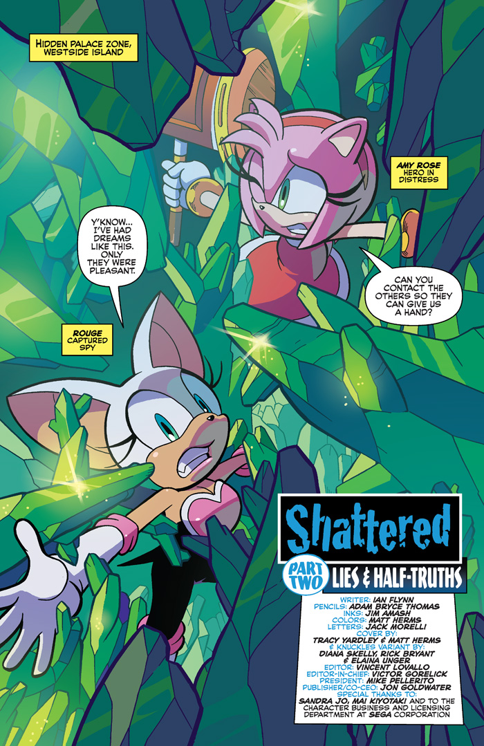 Tougher than leather, it’s Knuckles in “Shattered” Part Two: The mysteries deepen and the suspense builds! Amy and Rouge fight for their lives! Omega is out of commission! And Knuckles is lead deep into the heart of the Hidden Palace Zone by the mysterious Nixus! But is this strange newcomer everything he seems to be? Featuring cover art by Sonic comics legend Tracy Yardley and an “& Knuckles” variant by the delightful Diana Skelly!