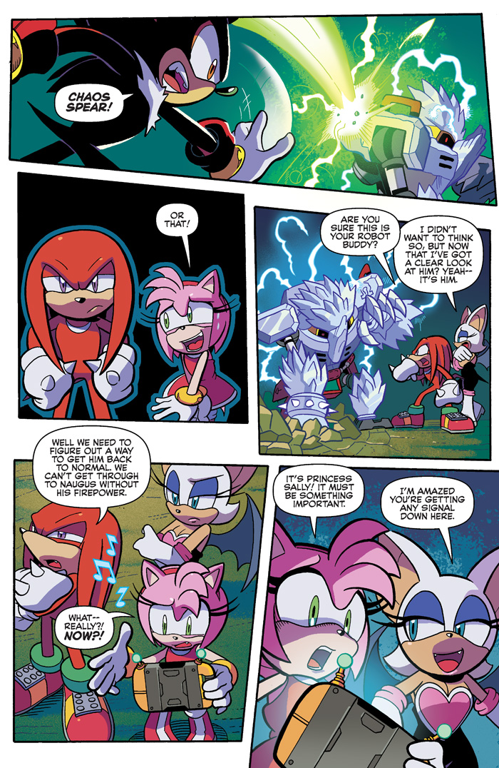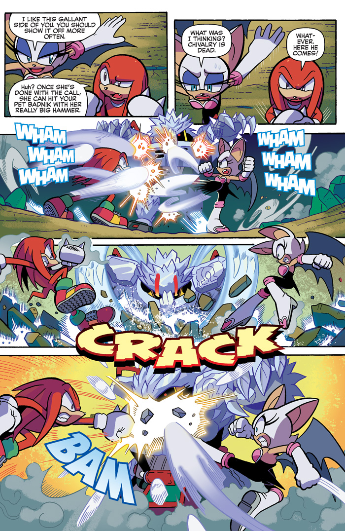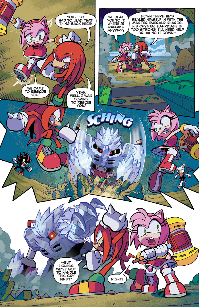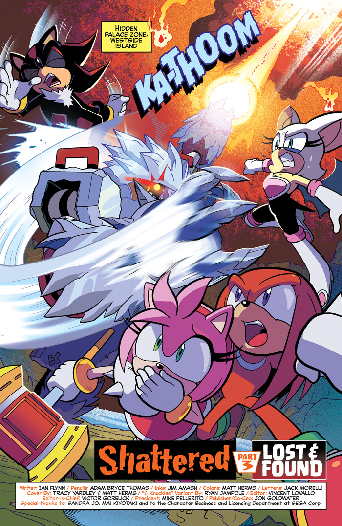 Knuckles is about to crack in “Shattered” Part Three: Time is running out for Amy, Knuckles and all of Angel Island!  As our heroes fight for their lives, the evil wizard Walter Naugus inches closer to completing the Master Emerald and regaining his full power! Can the gang pull through to stop the wacky warlock? Featuring cover art by Sonic comics veteran, Tracy Yardley and an “& Knuckles” variant by jamming Ryan Jampole!