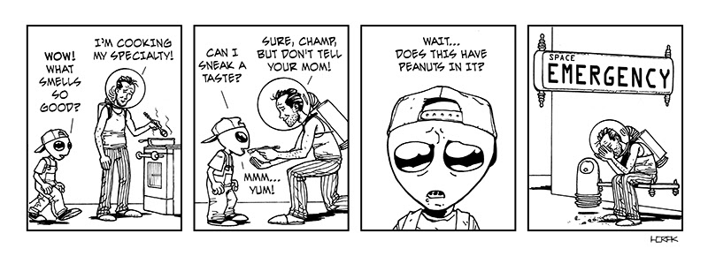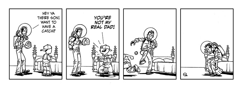 Meet Space Step Dad! An average human Joe living in an alien world just trying to keep the gun out of his mouth and connect with his step son! Created by the award winning (probably, right?) team of Eliot Rahal, Donny Cates and Matt Horak and appearing in the back pages of the new Dark Horse ongoing series, THE PAYBACKS, Space Step Dad is a cry out loud comic with UNIVERSAL appeal! For the whole family!