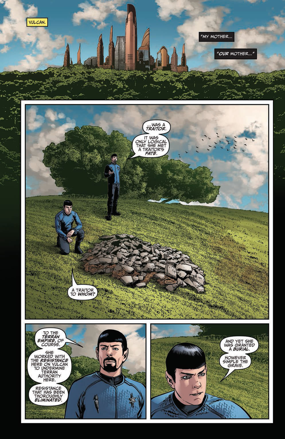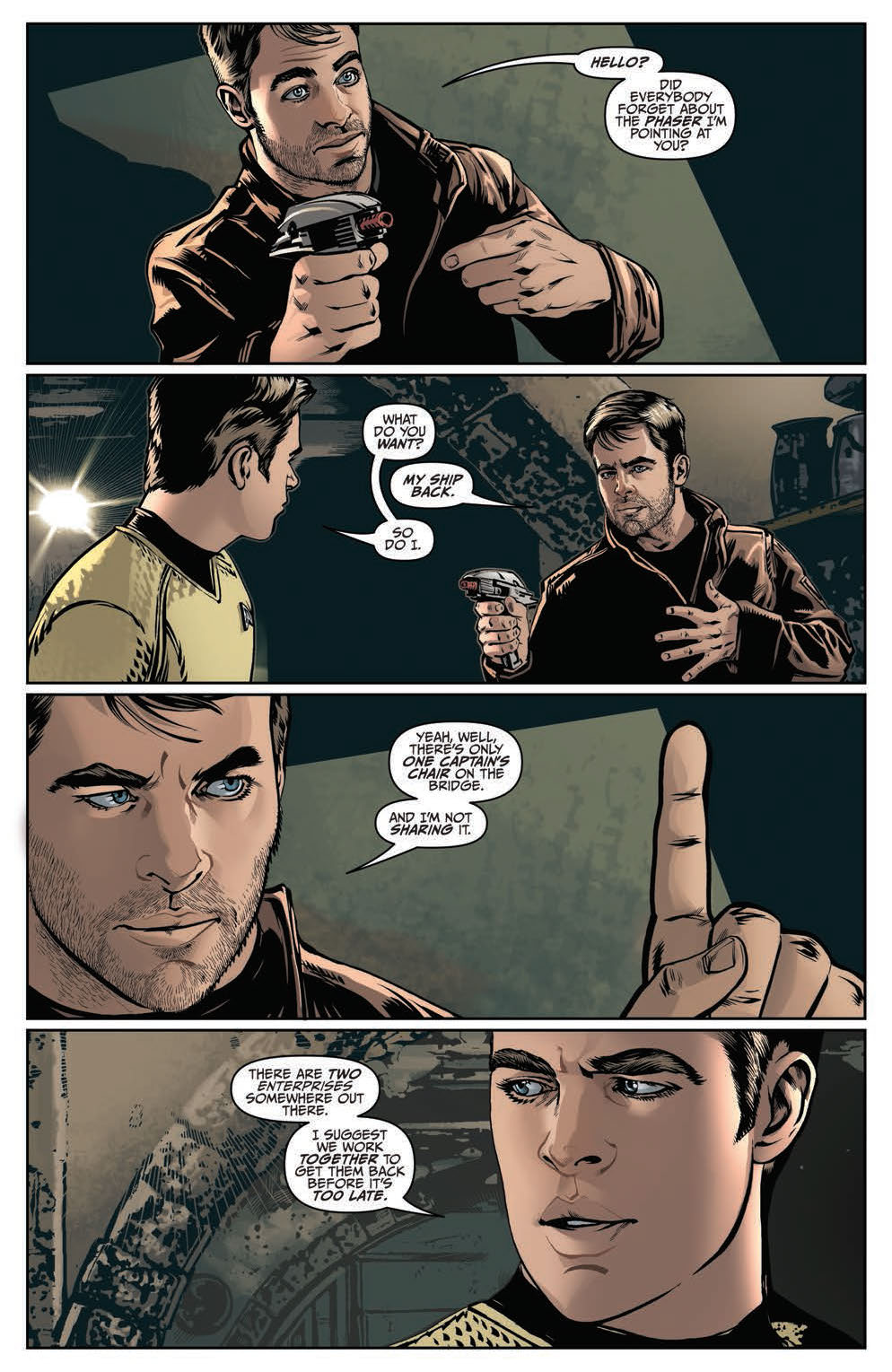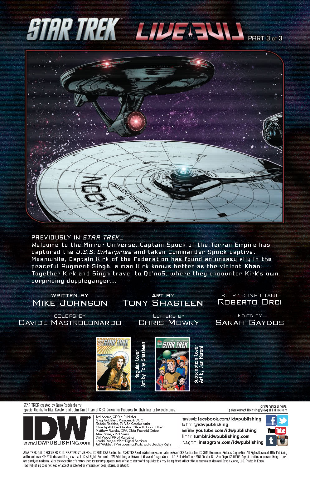 It’s the explosive conclusion to the Mirror Universe epic, as Kirk and Spock face off against their evil doppelgangers with the fate of two realities at stake! Who will live, who will die, and what role will the Mirror Universe Khan play in the endgame? Don’t miss this all-new adventure starring the cast of the new STAR TREK movies!