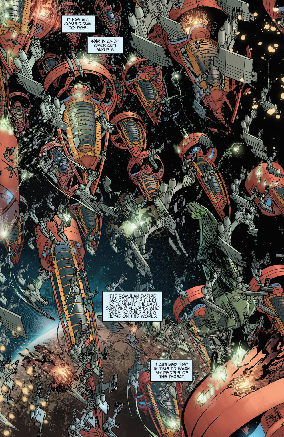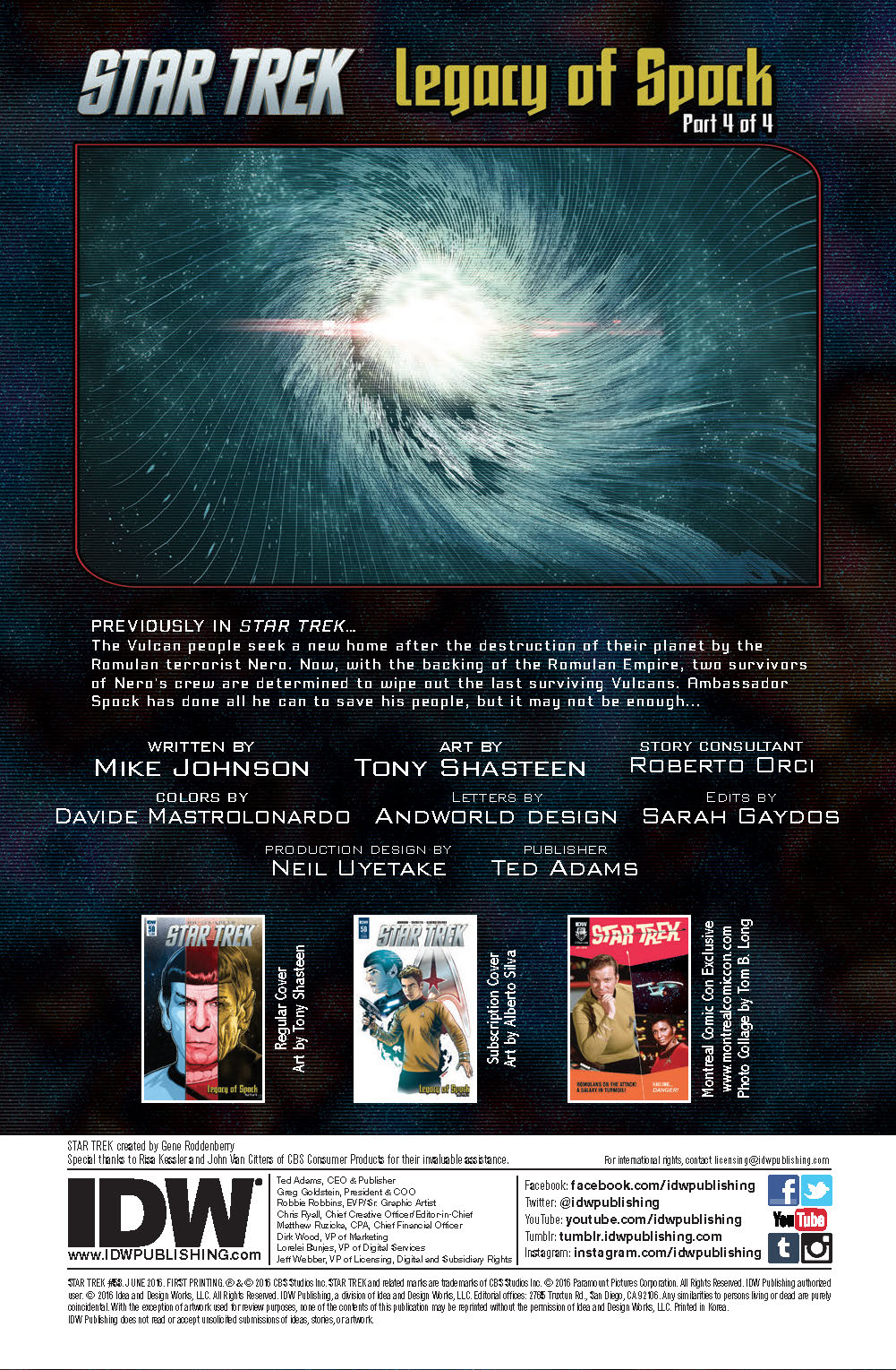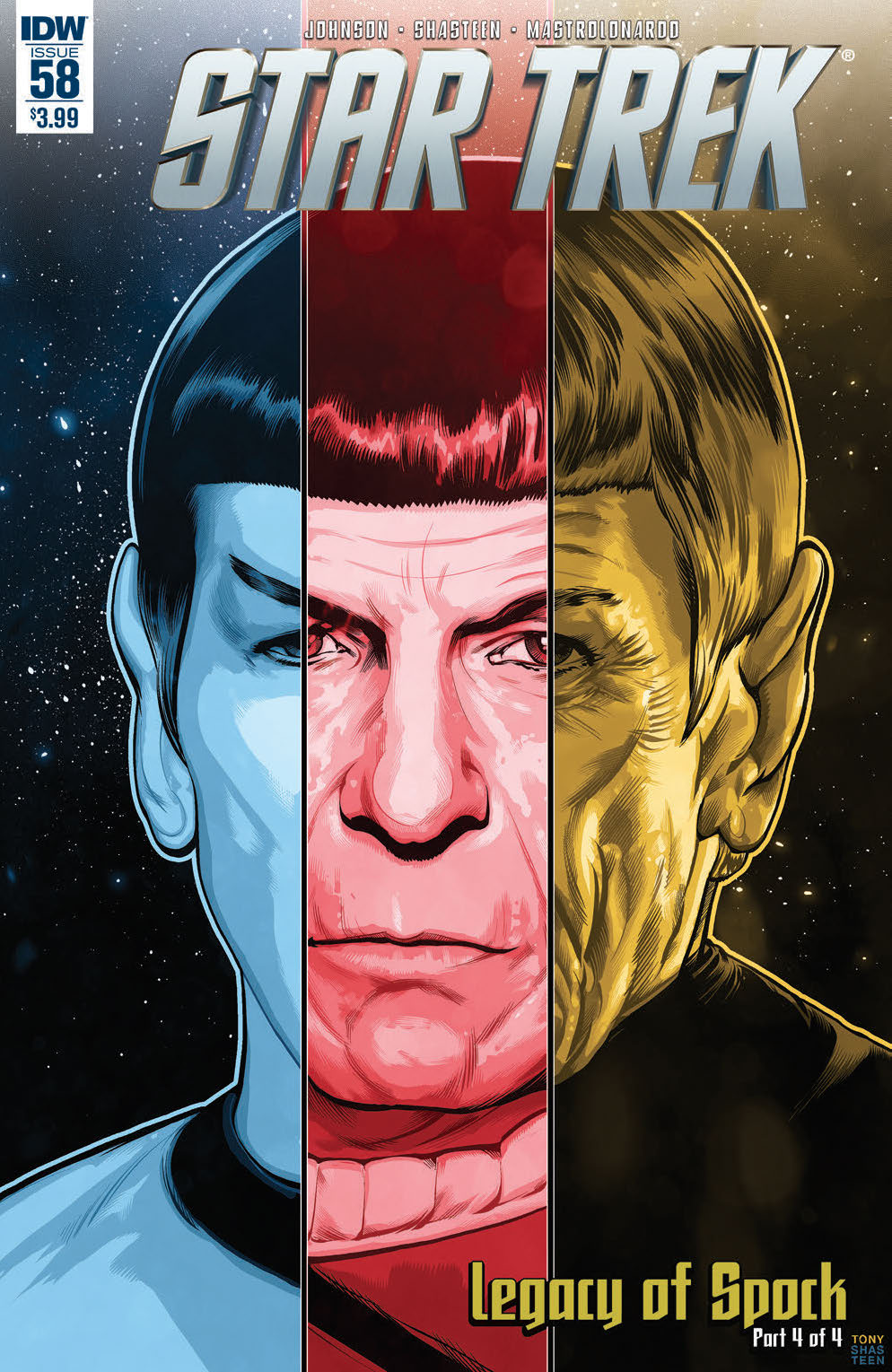 The stunning conclusion of “Legacy of Spock”! The fate of the Vulcan people hangs in the balance as Spock tries to prevent all-out war with the Romulan Empire! Will the Vulcans find a new homeworld on which to rebuild their civilization… or does this spell the end of their species? Don’t miss the final chapter of this mini-series event celebrating the 50th anniversary of STAR TREK!