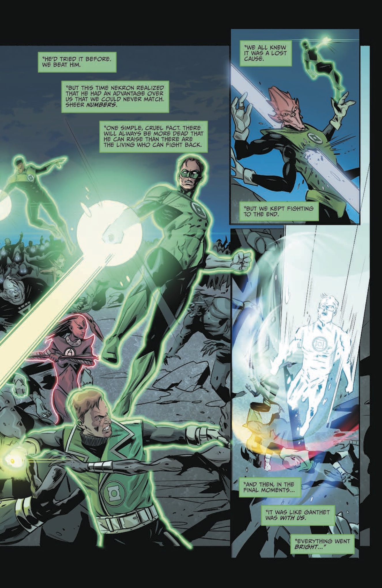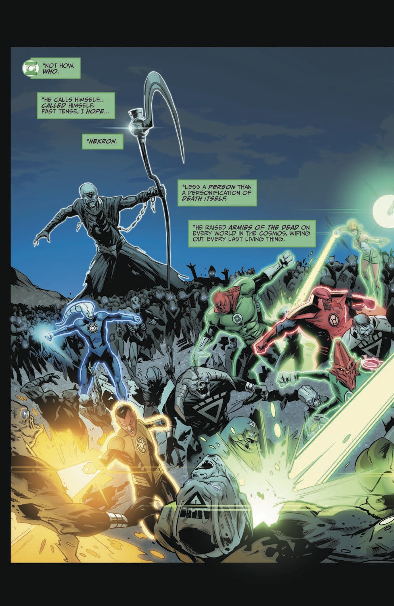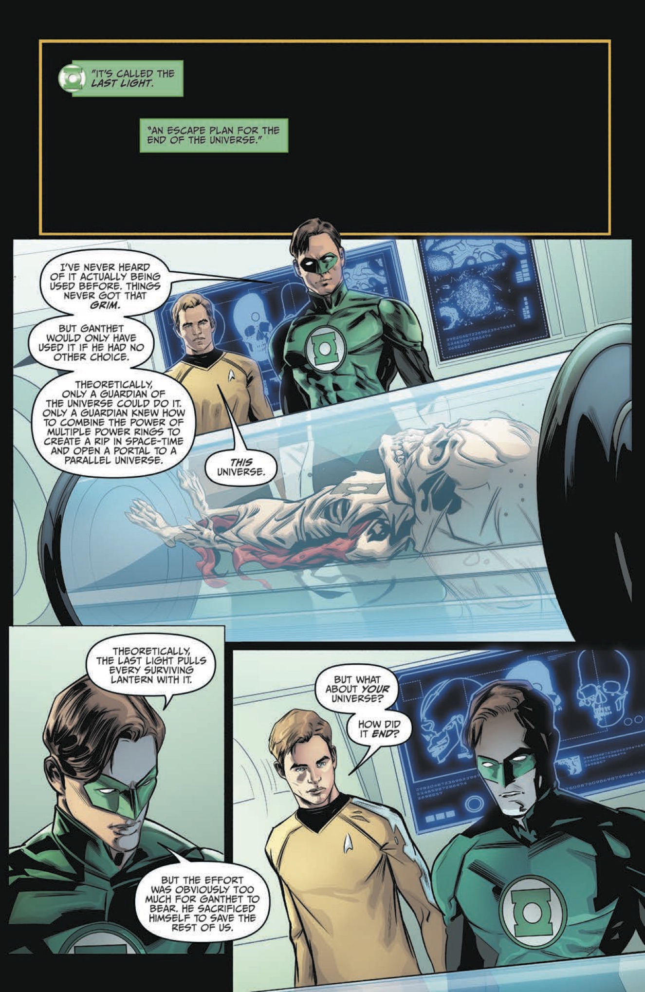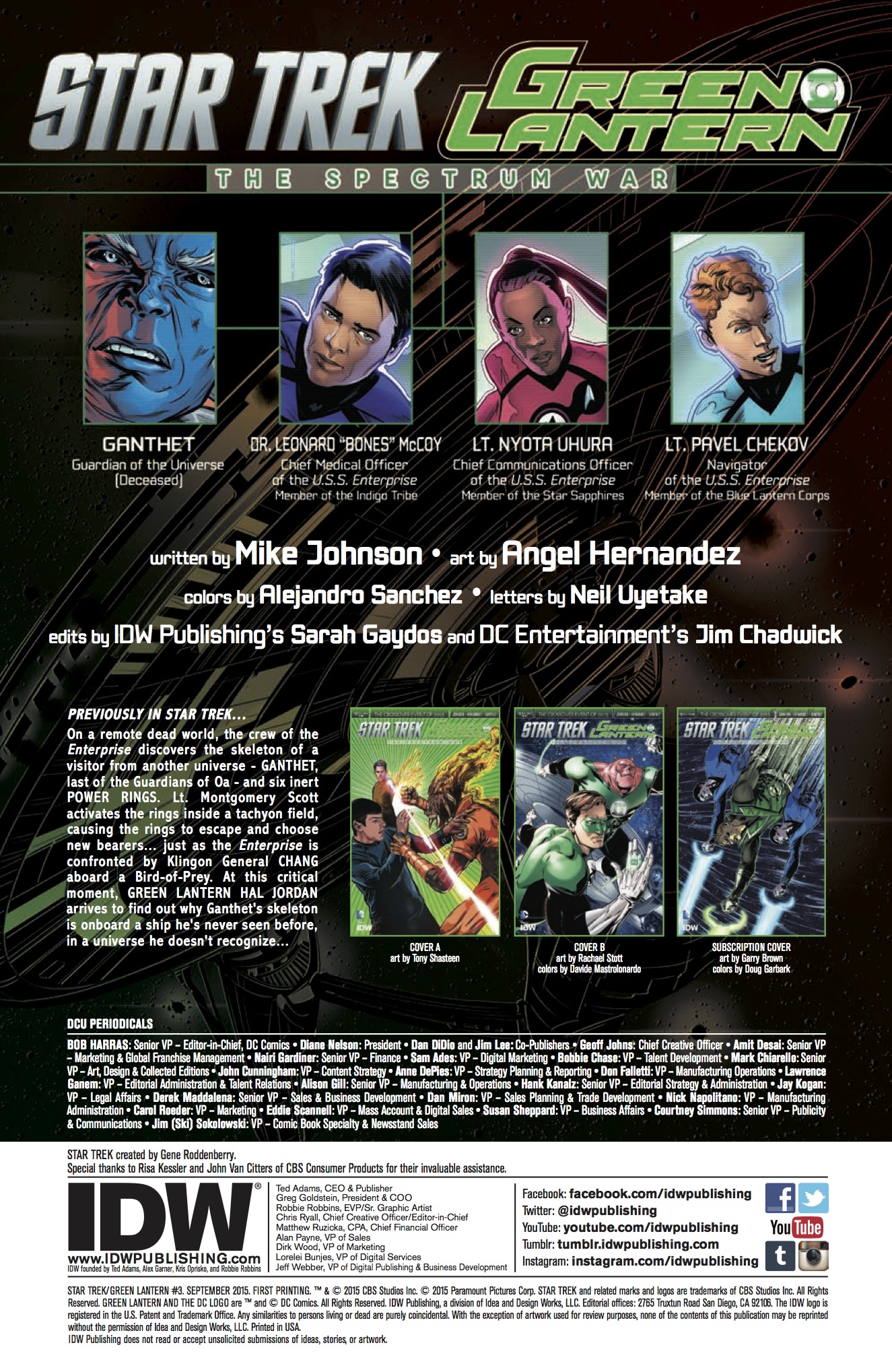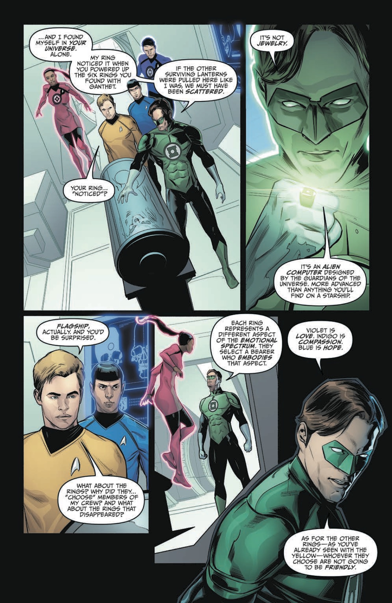 The blockbuster crossover event of 2015 continues here, as the galaxy explodes in a Lantern-fueled war between the Federation and its enemies! Captain Kirk and the ring-bearing crew of the Enterprise must join forces with Hal Jordan to prevent the loss of entire civilizations… as the identity of the villain behind it all is revealed!