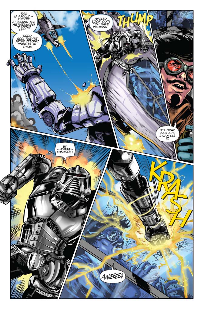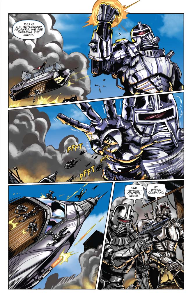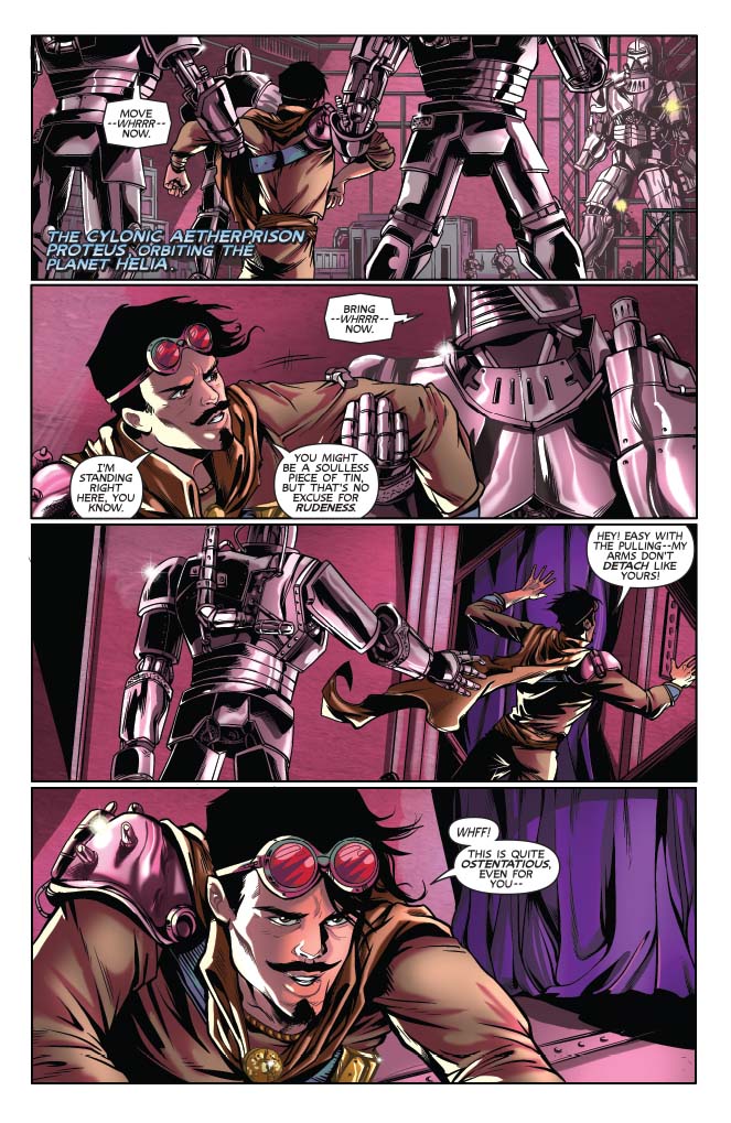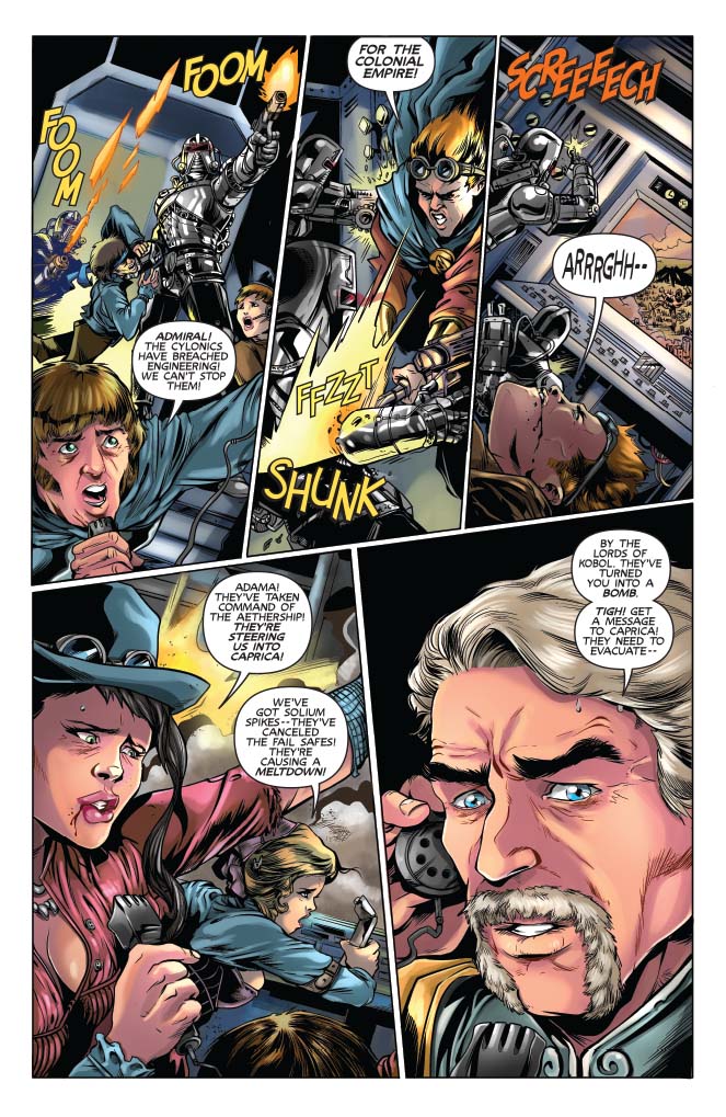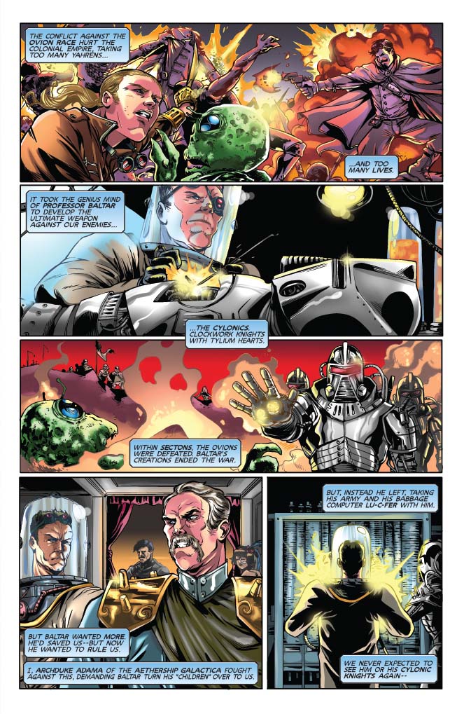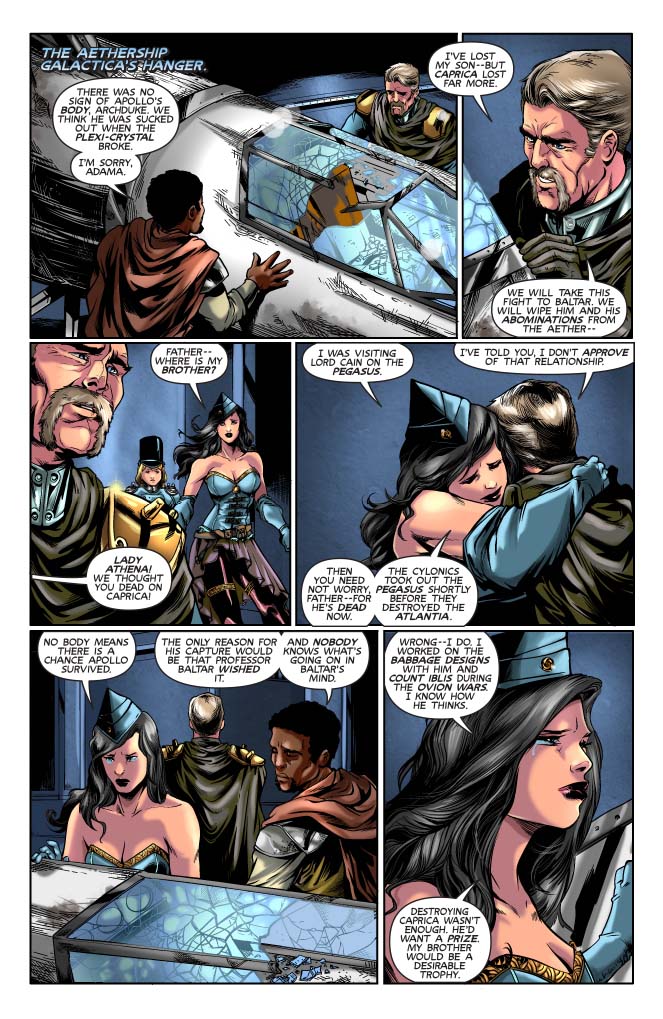 a Victorian aesthetic and Industrial Age metalworks!  When the colonial world of Caprica is destroyed by Professor Baltar’s clockwork army of city-trampling Cyclonics, Archduke Adama of the Aethership Galactica takes to the skies… choosing the survival of the human race over the rescue of his captive son, Apollo. Disobeying orders and striking out on her own, Lady Athena seeks to free her kidnapped brother with the help of the runaway pilot, Captain Starbuck, and his humanoid Daggit copilot, Muffit… if only they can withstand an assault by vengeful Sky Pirates! Will the ironclad ships and daring spacefarers of this Steampunk universe endure the mechanical menace of the Cyclonics?
