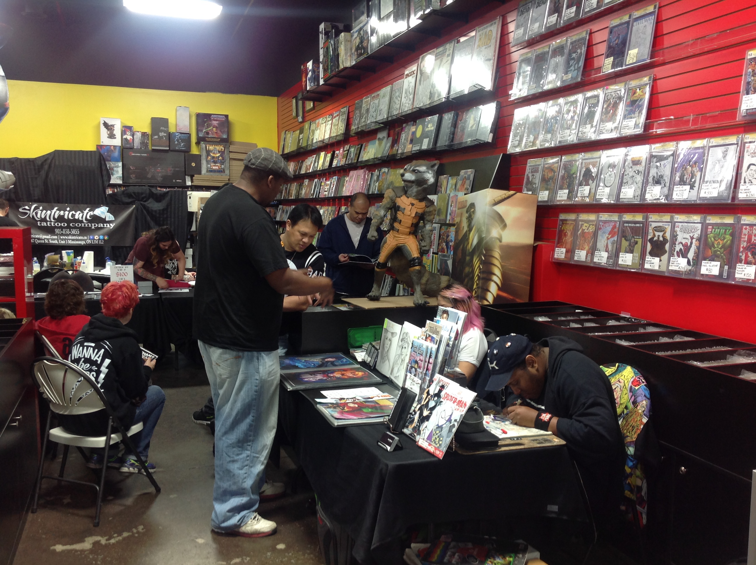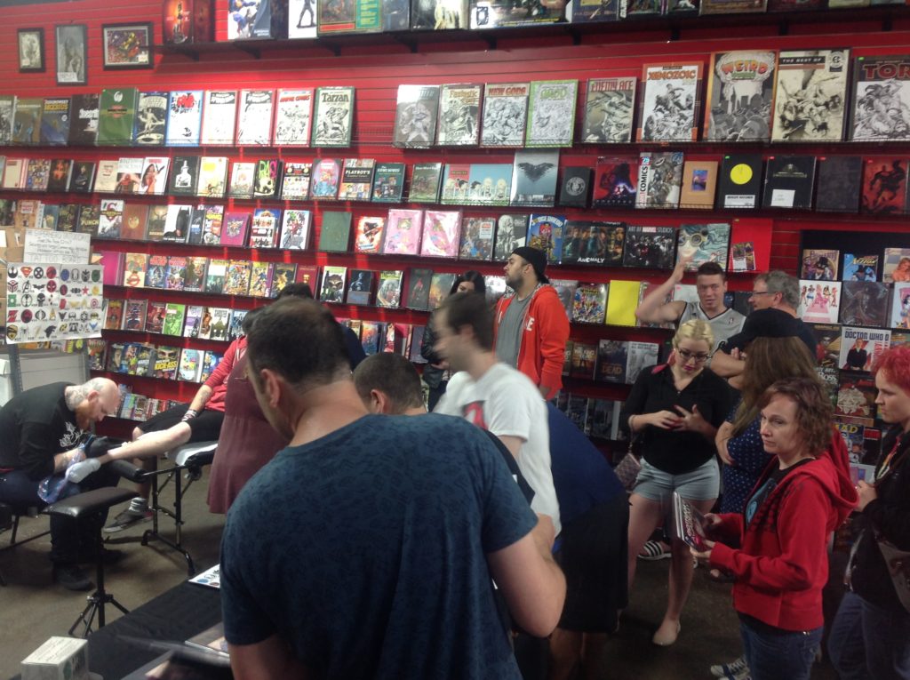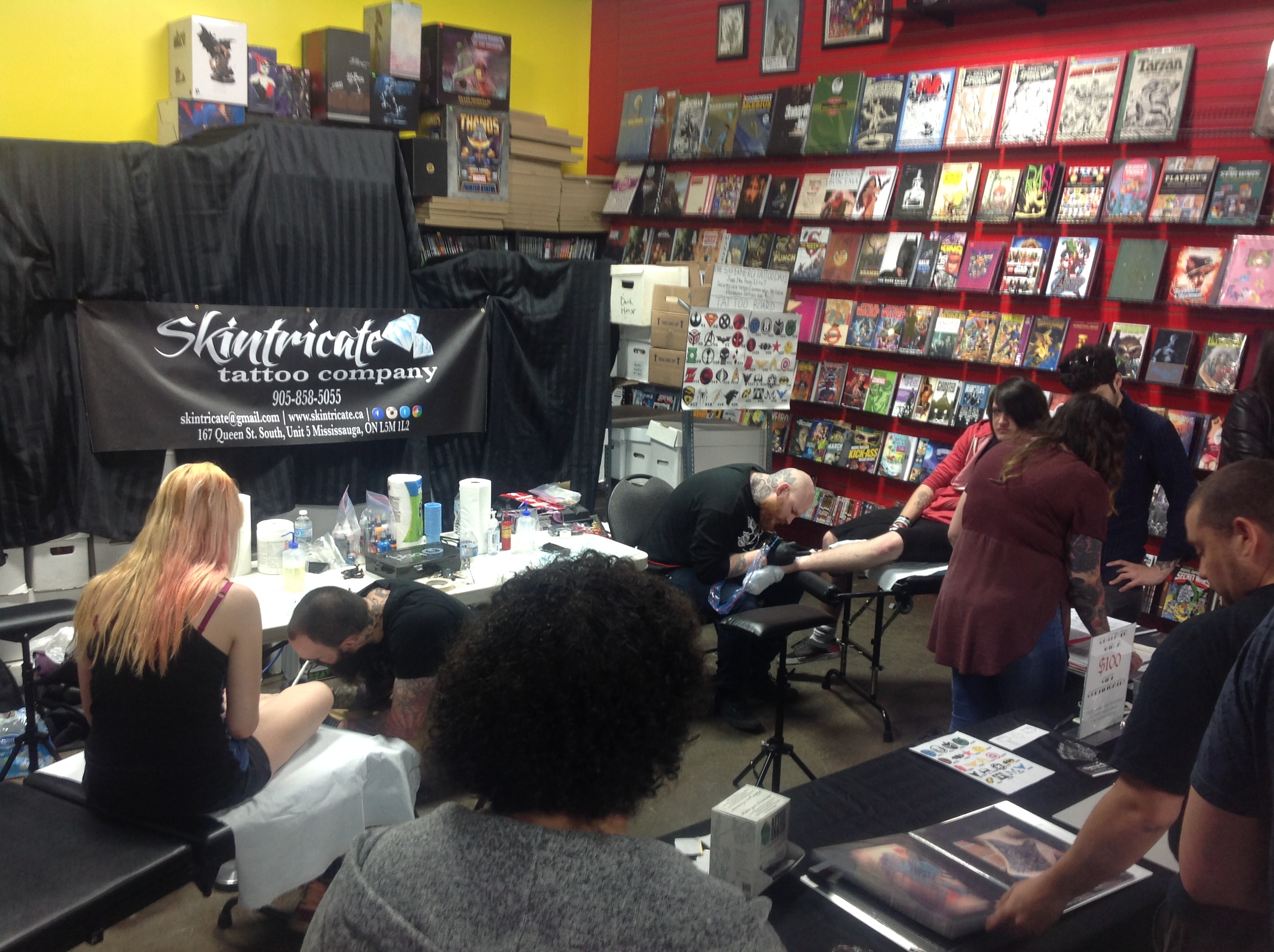 Overcast skies and persistent rain didn’t dampen the enthusiasm for Gotham Central Comics and Collectibles’ Super Hero Tattoo Day on Sunday afternoon. Customers came in to get tattoos of their favorite superheroes and to pick up the latest comics and collectibles on Gotham’s shelves. The tattoos were provided by Mississauga’s Skintricate Tattoo Company and patrons chose from a wide range of tattoos from some of the most popular pop culture icons and franchises including Star Wars, Star Trek, Superman, Batman and Captain America.