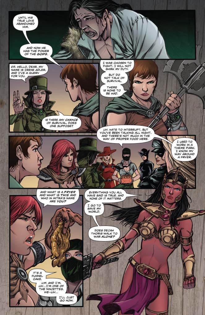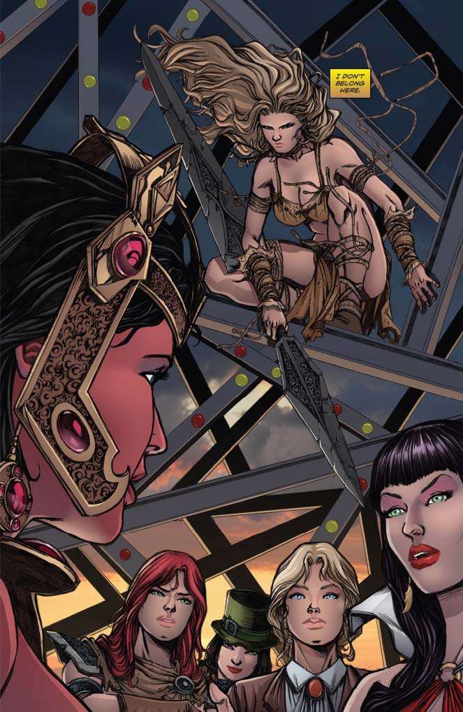 As the epic era-spanning tale rockets towards conclusion, reluctant heroines find themselves facing terrifying alternate versions of themselves on the road to the ultimate showdown with the Prince Of All Worlds. Can even the combined forces of Kato, Red Sonja, Dejah Thoris, Vampirella, Jungle Girl, Lady Zorro and dozens more save reality? Join us for the penultimate chapter in what critics are calling the best crossover event of the summer!
