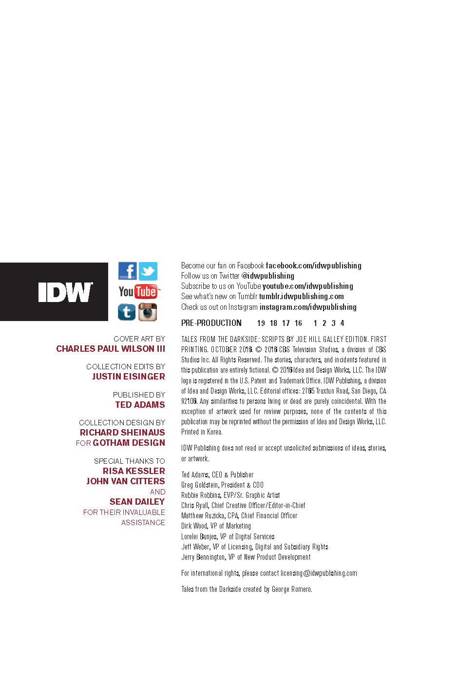The storied history of TALES FROM THE DARKSIDE winds ever darker and weirder with this collection of scripts by Joe Hill from the never-broadcast 2015 television reboot. TV’s loss is your gain as these all-new tales break out of the shadows and spring to vivid life at Hill’s command, accompanied by striking illustrations provided by Charles Paul Wilson III (Wraith). Fans of horror, Darkside, and Hill will not be disappointed.