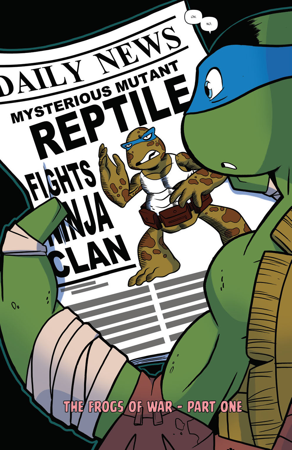 “The Frogs of War” Part 1! Napoleon Bonafrog comes to NYC to enlist the help of the Turtles. To what end? The answer soon becomes clear: Tiger Claw has convinced Napoleon’s mutant frog family to join the Foot Clan!!