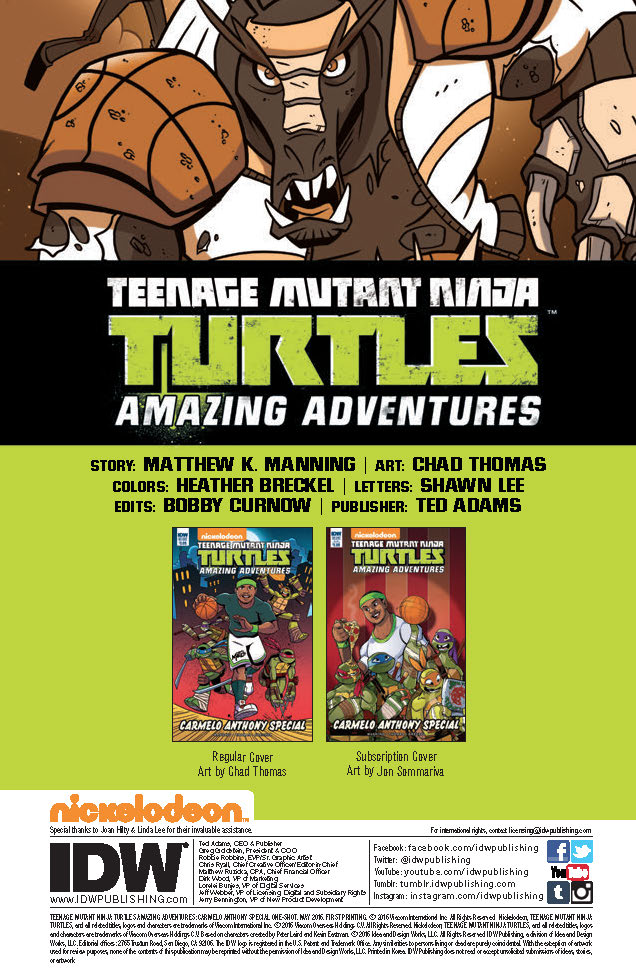 The Turtles meet NBA superstar Carmelo Anthony in this oversized special! When Carmelo is captured by the Foot Clan, it will be up to the Turtles to save him. But after Carmelo is mutated someone may have to save the Turtles instead!