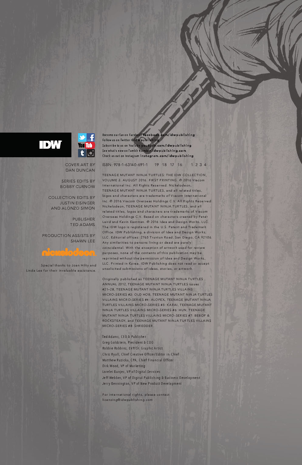 Violence and carnage rage across the city as Shredder’s master plan unfolds. When tragedy strikes the Turtles, the brothers will have to hold the line against an attack from within, but with allegiances shifting they must formulate a plan to fight back against their deadliest enemy. Volume 3 collects issues #21–28 of the Teenage Mutant Ninja Turtles ongoing series and the Old Hob, Alopex, Karai, Hun, Bebop and Rocksteady, and Shredder Micro-Series one-shots, plus the 2012 Annual.