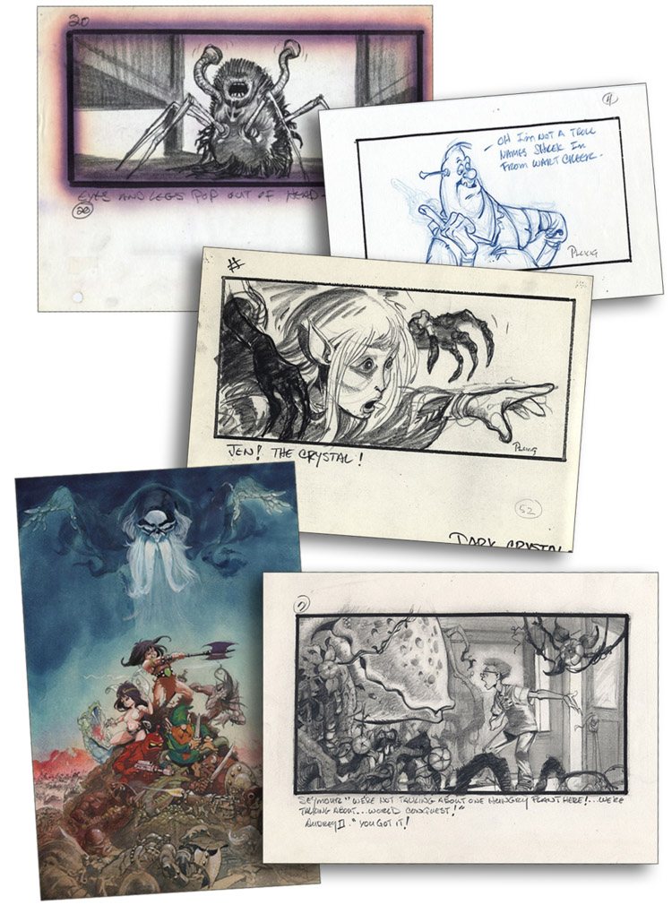 Next the book goes into detail on his movie career showcasing storyboards for some of the films he’s worked on. From his animated features such as Shrek and the Ralph Bakshi Lord of the Rings and Wizards to live action movies like X-Men, Little Shop of Horrors and my personal favorite The Thing. Each of these storyboards shows in detail how the shots are supposed to be framed and the direction taken and if you watch the movie along with looking at these storyboards you can see how flawless it was in its execution. Last but not least the book shows off paintings that Mike has done for various projects including the collectible card market. Each of these paintings are simply amazing and are just a joy to look. This is especially true for the CCG ones because they are without the text of the cards and can be enjoyed on their own.