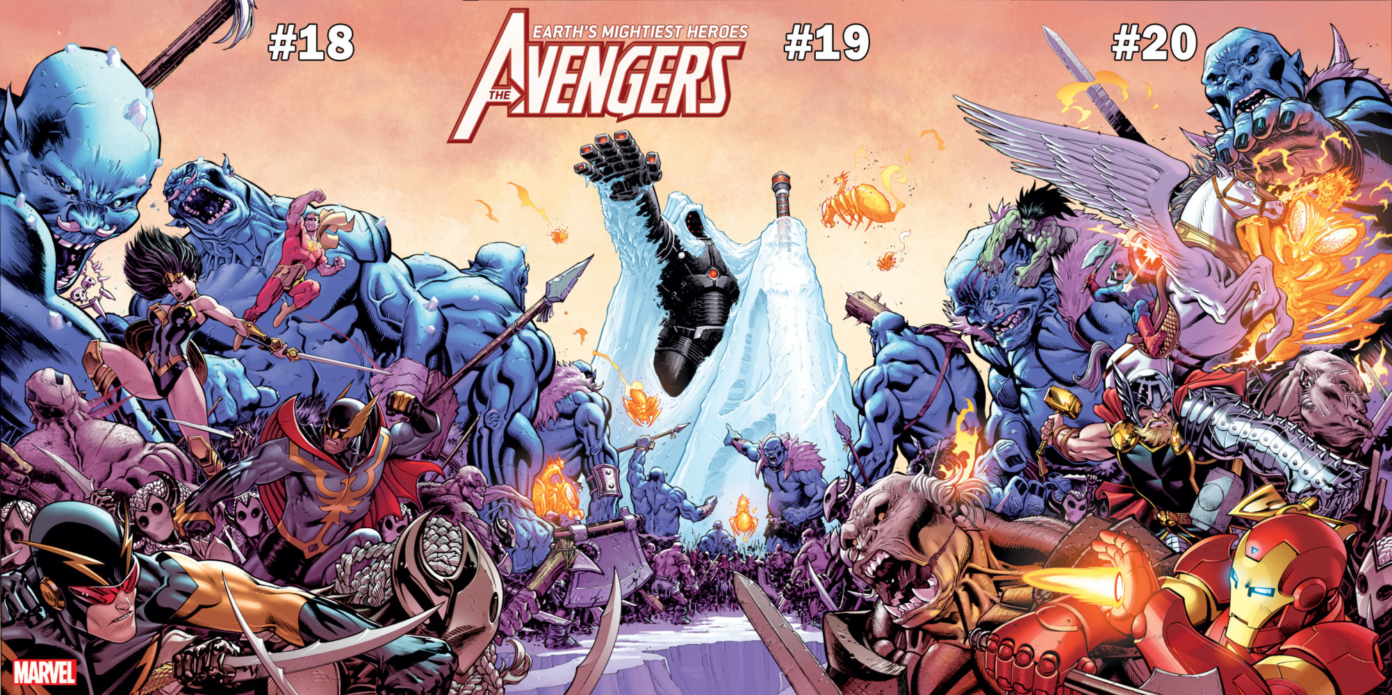 Don’t miss AVENGERS #19, the epic War of the Realms tie-in arriving in comic shops this May! And check out the stunning War of the Realms tie-in connecting cover by Ed McGuinness, featuring covers for AVENGERS #18, #19 and #20!