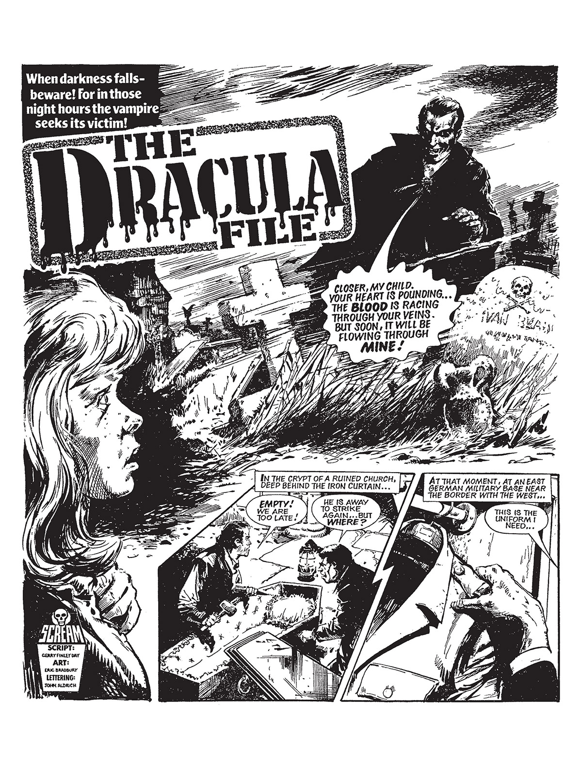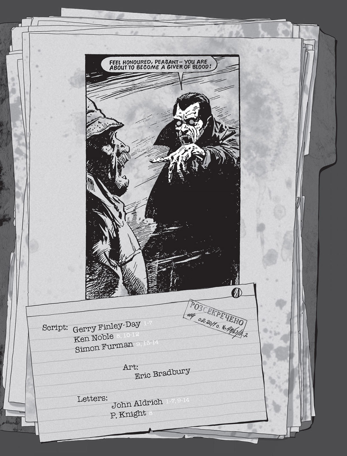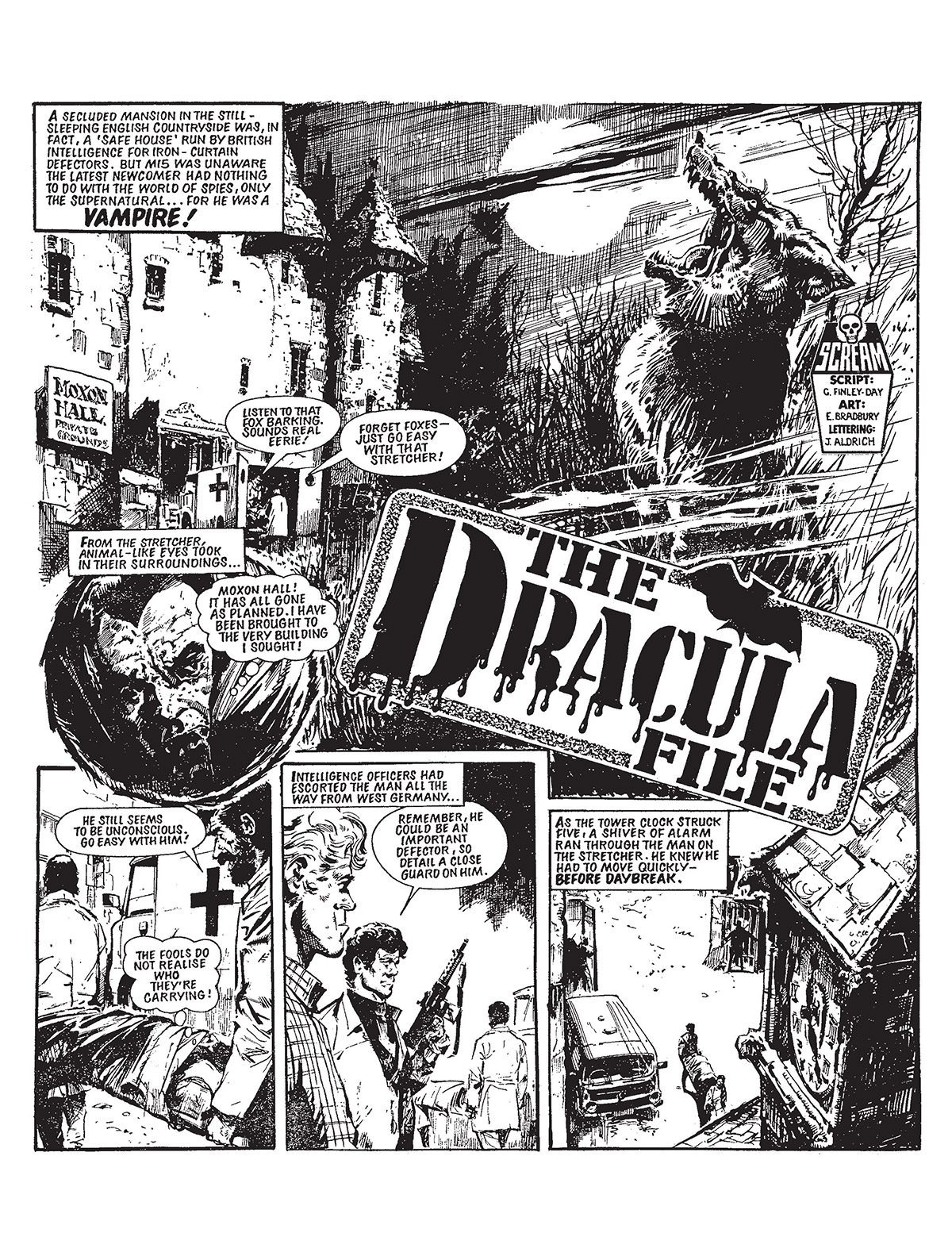 Fleeing vampire hunters from behind the iron Curtain, Count Dracula returns to Great Britain with an unquenchable thirst for blood! Unable to accept that the supernatural defector has slipped through his fingers, Rumanian KGB officer Stakis decides to defy his disbelieving superiors and destroy the unholy horror that has plagued the world for centuries. Will 1980s London become the Count’s permanent, new feeding ground? Written by 2000 AD stalwart Gerry Finley-Day and featuring Eric Bradbury’s nightmarish vision of horror’s greatest icon, The Dracula File is a book that you can really sink your teeth into!