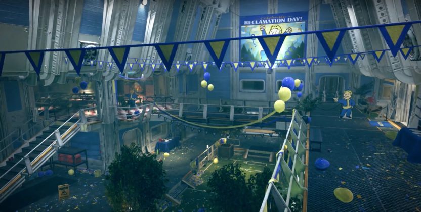 Starting out right off the bat we see that this is not an ordinary trailer. The “Please stand by” screen was usually in B&W but now it’s in color! As we zoom in on a radio of some kind the song Country Road starts up and we get a view of a vault. There are some things to take note of such as there’s a poster celebrating from 1776 to 2076. We are treated to other shots of the vault showing off a color television, a newer computer and a giant atrium revealing tons of balloons and decorations as a banner proclaims it’s “Reclamation Day”. We then are shown a shot of the back of the main character wearing a vault jumpsuit with a gold 76 on the back and a fancy looking pip boy. Finally we hear a voice saying “In Vault 76 our future begins”.