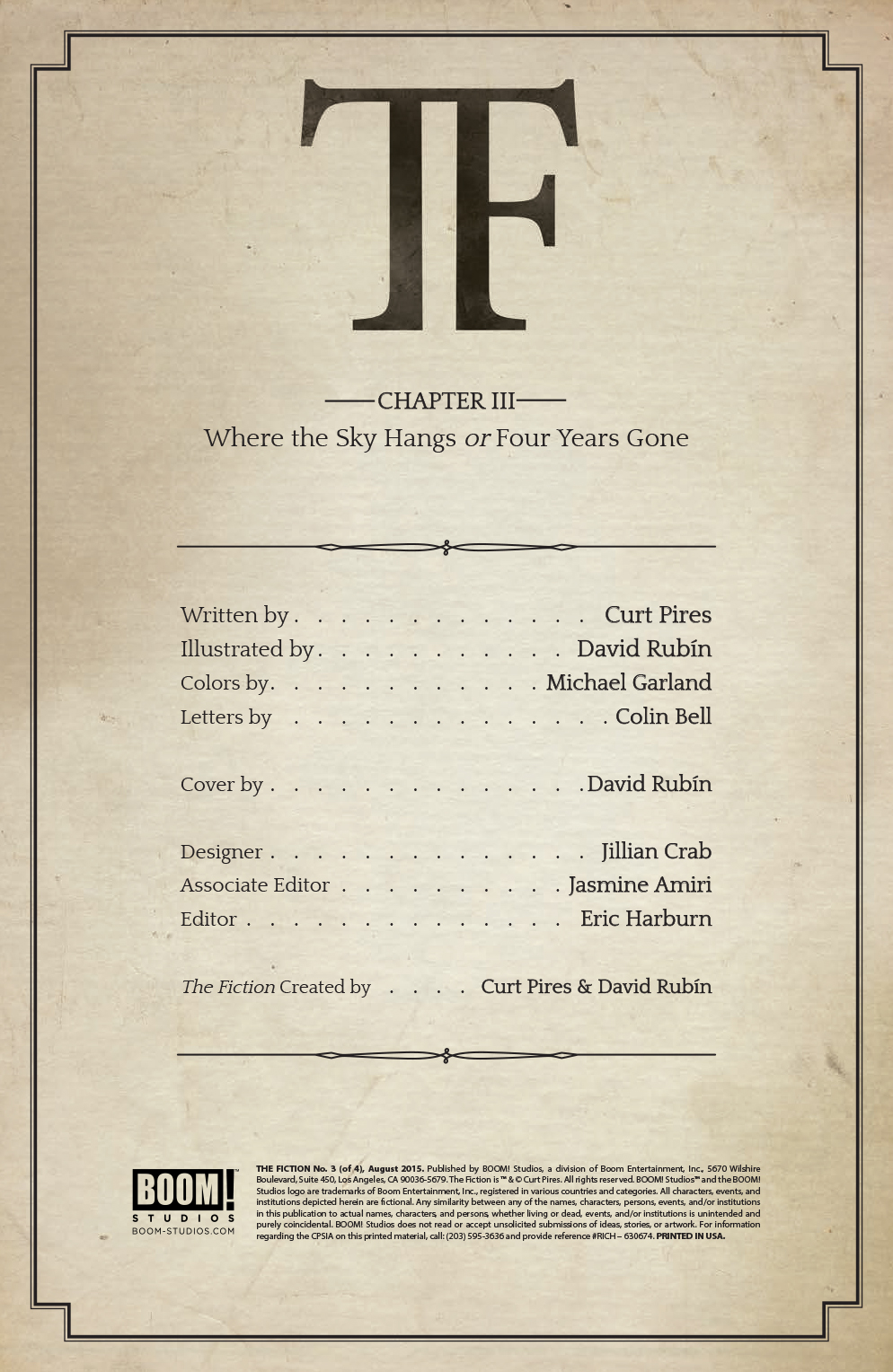 PreviewsBOOM! Studios Previews The Fiction #3 (of 4) By Comix Asylum - Aug 17, 2015 0 700 FacebookTwitterPinterestWhatsApp Author: Curt Pires Artist: David Rubín Kassie, Max, and Tyler are held captive by the Corruption in the Fiction, and we find out what happened to Tsang when he disappeared as a child. The Fiction #3 (of 4) 1 of 7