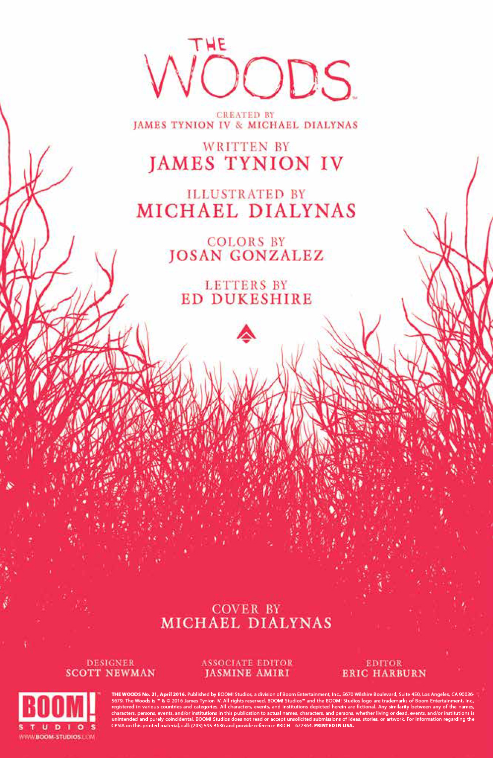 PreviewsBOOM! Studios Previews The Woods #21 By Comix Asylum - Mar 31, 2016 0 545 FacebookTwitterPinterestWhatsApp The Woods #21 Writer: James Tynion IV Artist: Michael Dialynas Karen leads the survivors into the woods to regroup and plan revenge. The Woods #21 1 of 7