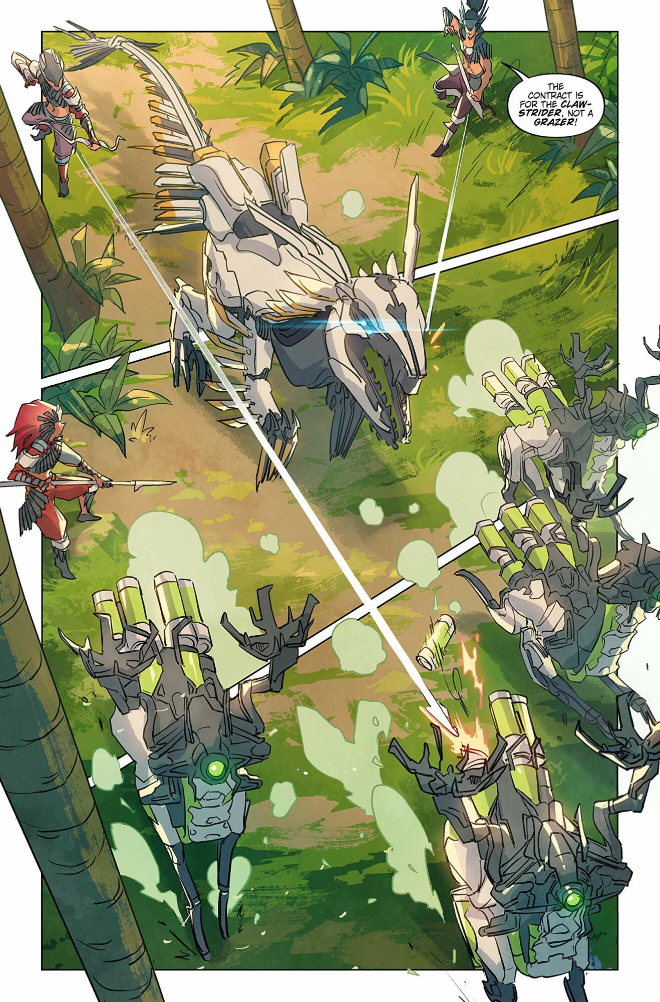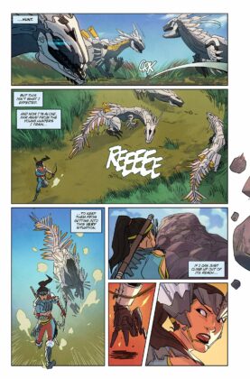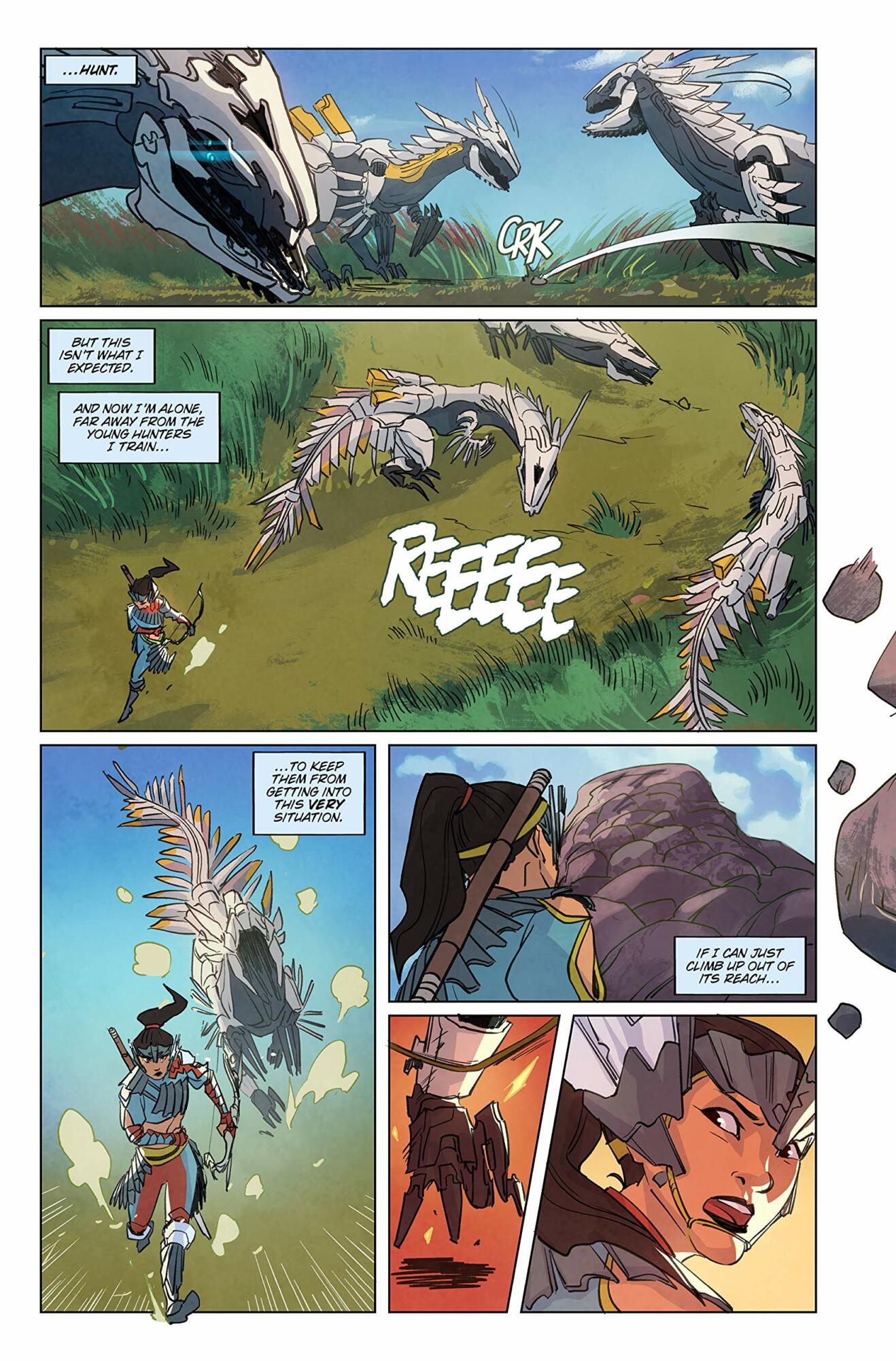 HORIZON ZERO DAWN VOL 1: THE SUNHAWK collects issues #0 – #4 of the single issue comics and is available in all bookstores or through Amazon, Forbidden Planet and Comixology