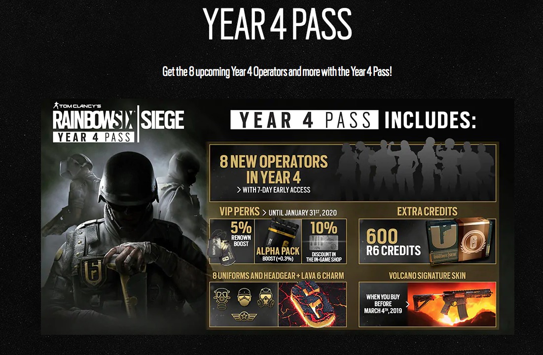 Additionally, the Volcano Signature weapon skin will be offered to those who purchase the Year 4 Pass before March 4th, 2019. As a reward for the players’ loyalty, owners of the Year 3 Pass will receive an additional 600 Rainbow Six credits when they purchase the Year 4 Pass.