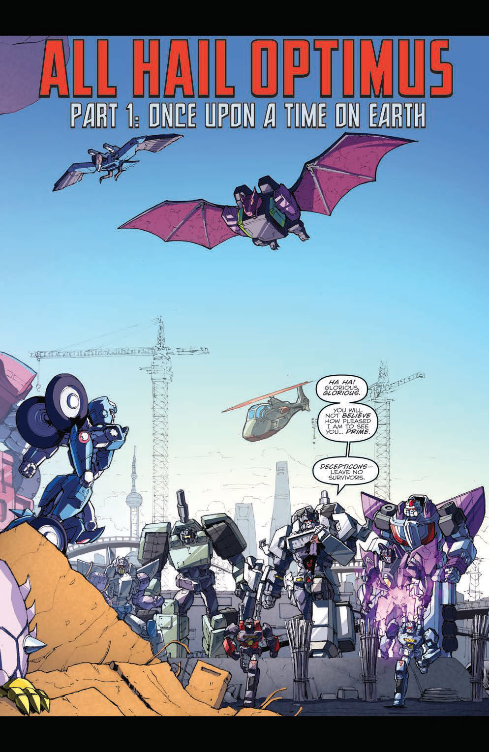 ALL HAIL OPTIMUS—PART 1! Backed by an army of zealous followers, OPTIMUS PRIME declares Earth to be a part of CYBERTRON’S Council of Worlds—and the DECEPTICONS and the people of Earth don’t won’t take it laying down! The story starts here, but the repercussions will last forever.
