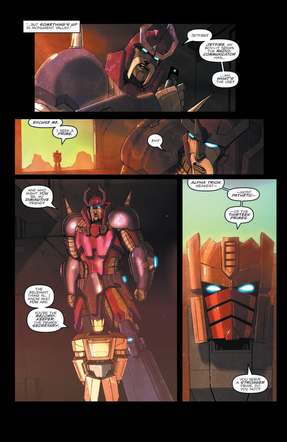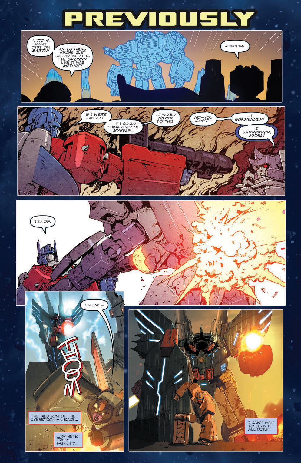TITANS RETURN! Following the literally-Earth-shattering events of last issue… OPTIMUS PRIME establishes a new base of operations—AUTOBOT CITY! Its first visitor: a newly-revived SENTINEL PRIME, who sees a potential ally in OPTIMUS.