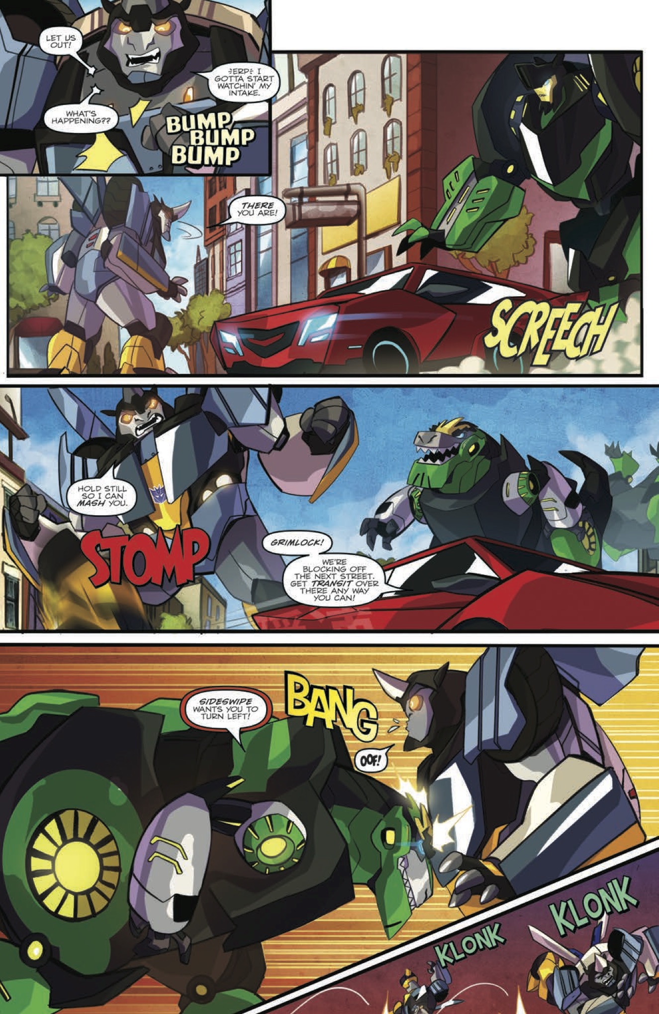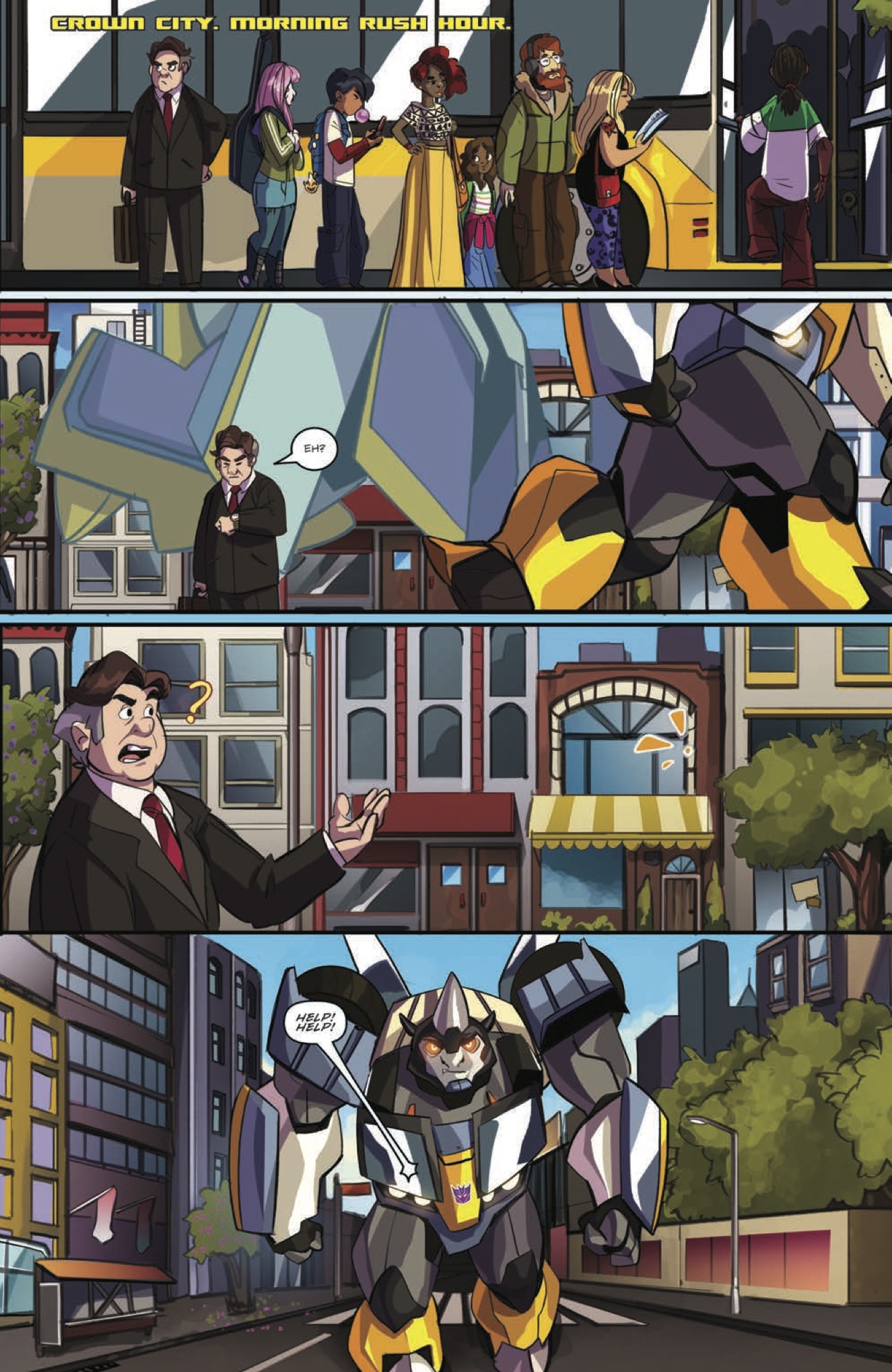 ROAD RAGE! While a DECEPTICON called TRANSIT wreaks havoc on afternoon commutes, Team Bee gets an unexpected visit… but will these new rivals combine forces without trusting each other?