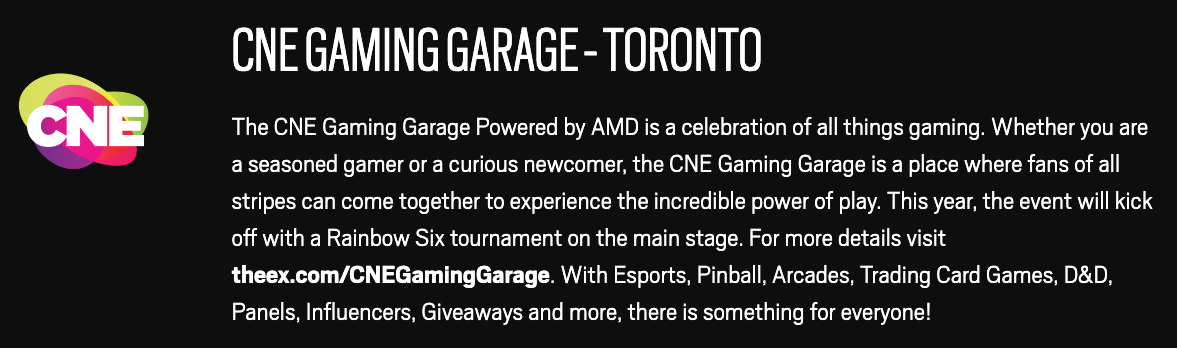 In addition, CNE Gaming Garage, a celebration of all things gaming hosted in Toronto, will kick off this year’s edition with a Rainbow Six tournament on August 16 from 12-9 p.m. on the main stage.