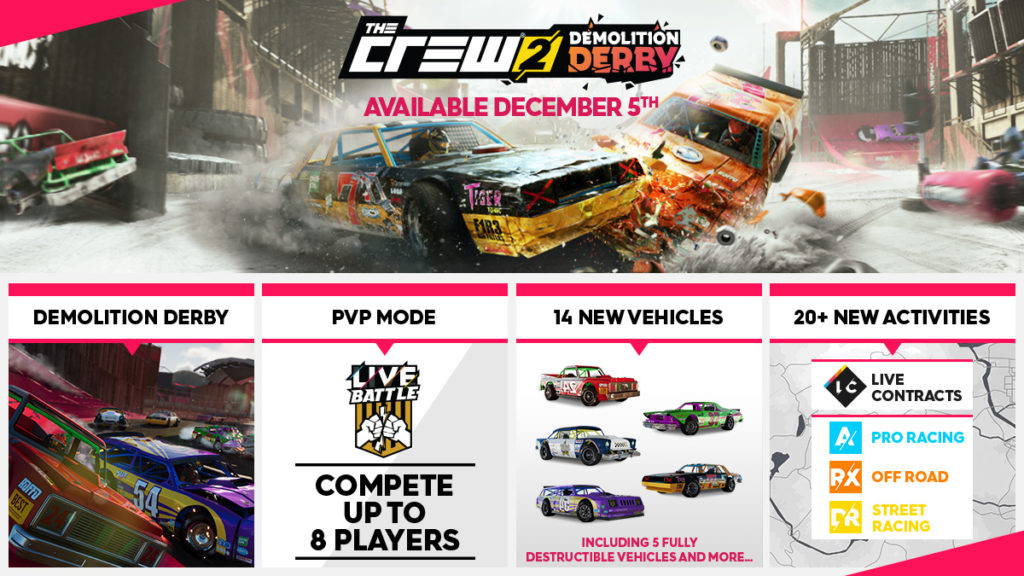Montreal – November 28, 2018 – Today, Ubisoft announced that Demolition Derby, the second free update brought to Ubisoft’s open world motorsports game, The Crew® 2, will be available on December 5 on PlayStation®4 computer entertainment system, the Xbox One family of devices including Xbox One X and Windows PC.