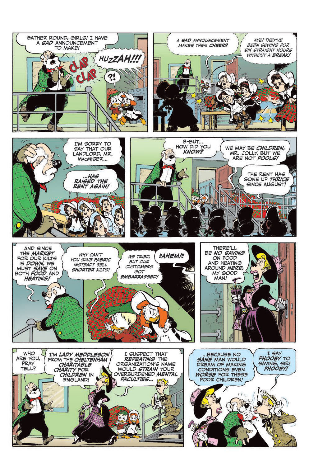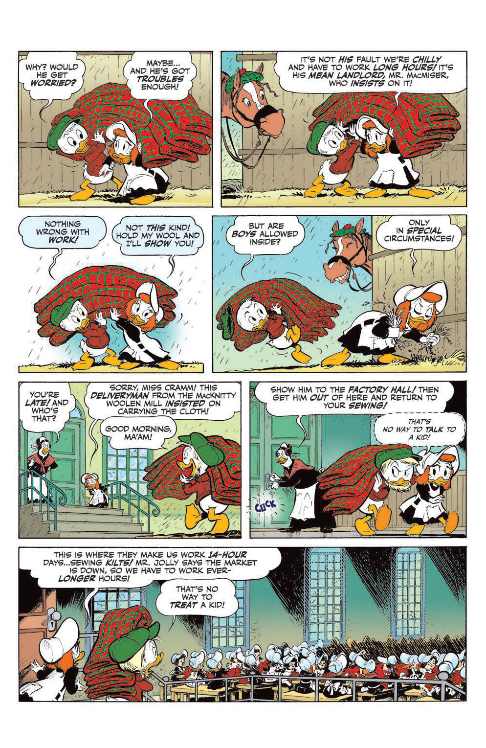 “The Substitute Santa of Scotstounhill!” Jump back to long-ago Scotland for a new tale from Scrooge McDuck’s Life and Times! Did you know Christmas parties were banned in long-ago Scotland? It’s true… and it was just another roadblock in the way when Young Scrooge tried to rescue an orphan buddy from a sinister sweatshop!