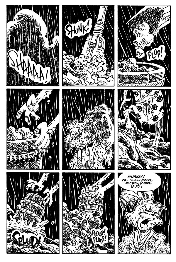 Usagi’s travels take him to a village plagued by rainstorms threatening to destroy it. While the rabbit ronin organizes the men to build a levee, the defenseless town is ransacked by bandits. Now Usagi and his companions must choose: chase after the brigands and risk a flood or finish the dike and face starvation!