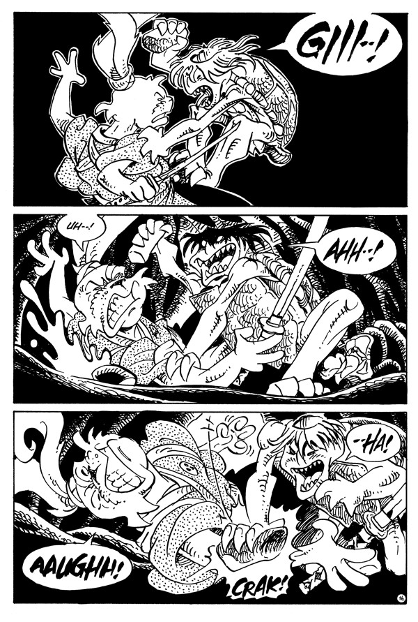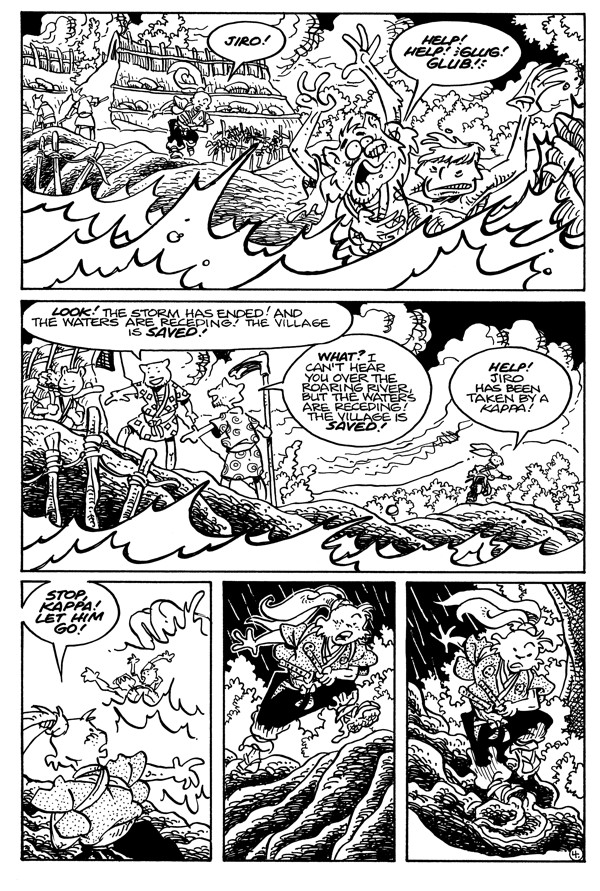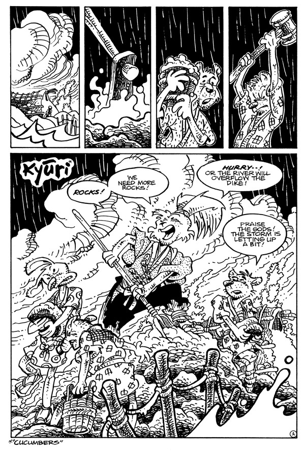 In his effort to save a village, Usagi’s fate takes a turn when he must defend a kappa—a supernatural creature that would normally be his enemy—from an even deadlier threat: a renegade of its own species! The trail leads him to the monster’s lair with his only weapons: two swords and some cucumbers!