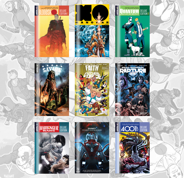 At the $8 or more tier, unlock a new tier of books that includes volume one trades of FAITH AND THE FUTURE FORCE, HARBINGER RENEGADE, GENERATION ZERO, and the HARBINGER WARS DELUXE EDITION and SECRET WEAPONS DELUXE EDITION, as well as a discount code for 20% off all purchases at the Valiant Store!!