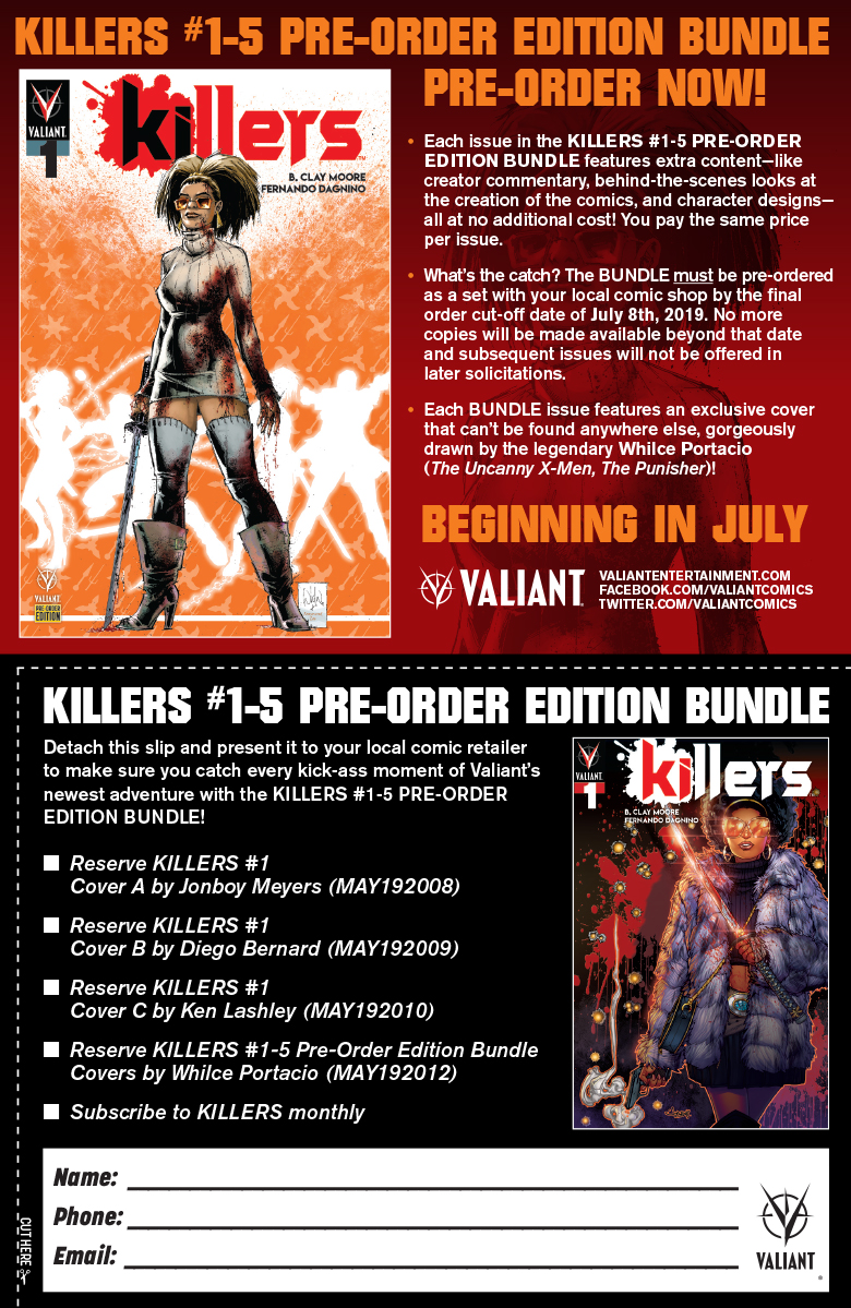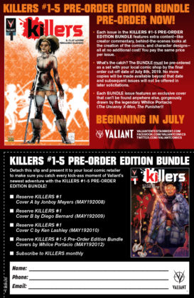 New York, NY (June 6, 2019) – Valiant is thrilled to announce the KILLERS #1-5 PRE-ORDER EDITION BUNDLE, the latest in the publisher’s initiative to allow readers to order a complete story arc or an entire run of a limited series in advance. Each KILLERS Pre-Order Edition issue will feature a cover rendered by comics luminary Whilce Portacio (Uncanny X-Men, The Punisher, Wetworks) and contain an extra eight pages of bonus material.