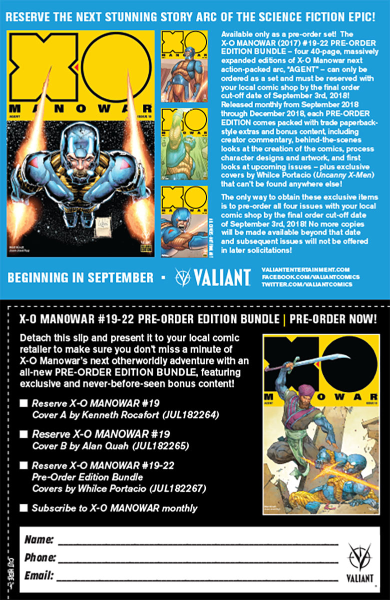 Fans and retailers, take note: The only way to obtain the X-O MANOWAR (2017) #19-22 PRE-ORDER EDITION BUNDLE is to pre-order all four issues with your local comic shop by the final order cut-off date of September 3rd, 2018! No more copies will be made available beyond that date and subsequent issues will not be offered in later solicitations!